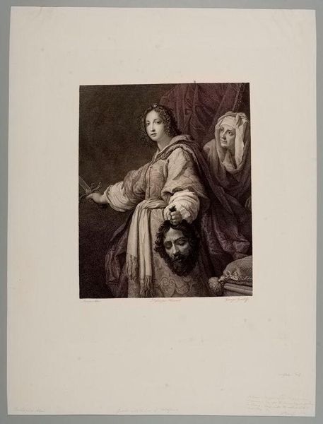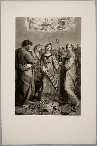 Editor: This is George Jakob Felsing’s "Madonna of the Throne" at the Harvard Art Museums. It has a serene, almost ethereal quality. What strikes you most about its imagery? Curator: I’m drawn to how the Madonna figure echoes across centuries of cultural memory. The child she holds is not just an infant, but a symbol laden with the weight of salvation narratives. Editor: So, you're seeing a connection to religious iconography? Curator: Absolutely. Note the book in her hand. Is it merely a prop, or does it signify the Word, knowledge, and perhaps even destiny? Consider also the angels at her feet – are they innocent cherubs or active participants in a divine drama? Editor: It’s amazing how much meaning can be packed into seemingly simple figures. Curator: Indeed. Felsing uses familiar symbols to tap into deeply ingrained cultural understandings. It’s a fascinating display of how images communicate across time.
