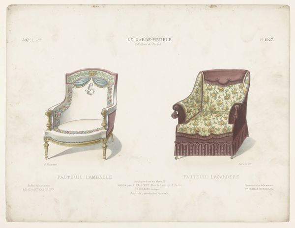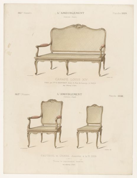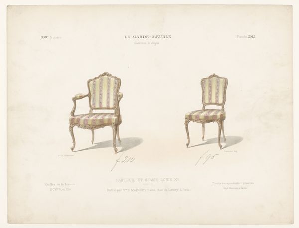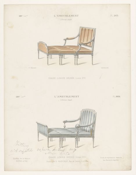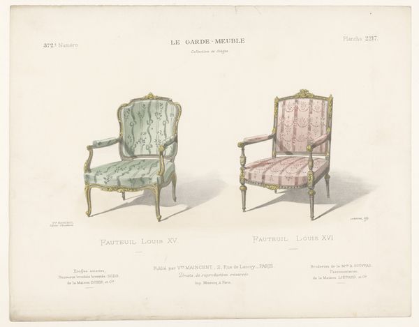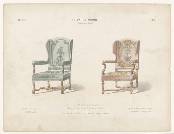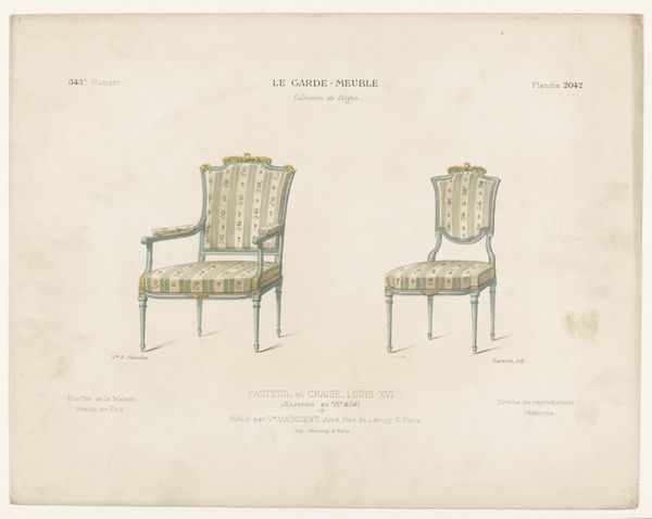 Léon Laroche created this print of two chairs, or "fauteuils," in the Louis XVI style, sometime in the late 19th or early 20th century. This was a period when the French aristocracy and its tastes were both idealized and critiqued. The Louis XVI style, with its emphasis on symmetry and delicate ornamentation, was an expression of power and luxury. Yet, the chairs themselves, rendered in print, become objects of study and perhaps even desire for a burgeoning middle class. We might consider how the chairs embody a certain kind of gendered performance. Were these seats intended for men or women? What social rituals or power dynamics were enacted through their use? The artist invites us to imagine the bodies that once occupied them. In a way, this print democratizes access to the aesthetics of power, making it available for scrutiny and reflection, as well as consumption. How do these chairs speak to our own aspirations, or to our own critiques of excess?