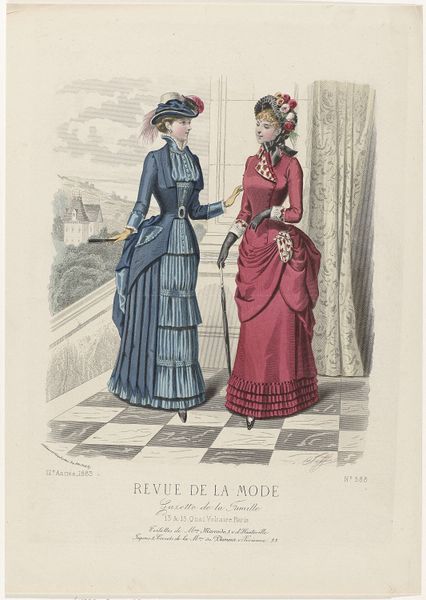 Curator: Here, we have an 1883 print entitled "Revue de la Mode, Gazette de la Famille, dimanche 22 avril 1883, 12e annee, No. 590: Toilettes de Melles Vidal (...)" by A. Chaillot, a piece crafted from a mix of drawing and printing techniques. Editor: My first impression is the incredible detail and ornamentation. Look at the explosion of fabrics and patterns! There is also an interesting juxtaposition of nature and artifice, with the two ladies positioned in a landscaped area. Curator: Indeed! These images circulated as a way to communicate an idealized lifestyle to readers in that era, showing these feminine ideals that the period imposed. Note how dress acted as a code to navigate social strata, aspirations, and identities. Editor: The title makes clear that these aren’t just pretty pictures, but images reflecting fashion standards of the day and also broader notions of feminine virtue, propriety, and status. It highlights how clothing dictated a lot, also creating expectations for feminine presentation. Curator: Precisely! We can look at the iconography within their dress, the puffed sleeves speaking of optimism and upward mobility. Editor: It’s difficult not to read this print as complicit with the patriarchal values of its time. Aren't these publications subtly instructing women on how to present themselves to appeal to the male gaze? Curator: Undoubtedly, such imagery perpetuates and enforces restrictive societal expectations regarding female identity. Still, it captures, perhaps unintentionally, aspects of defiance within ornamentation, where one might find moments of agency and individualism, a quiet but potent act of reclamation. Editor: That's a perspective that offers more space for thought. Despite everything, this image reminds me how visual language preserves societal values and nuances through time. It's like opening a dialogue with the past! Curator: Yes, delving into these intricate symbols lets us understand and unravel echoes of social conventions and personal affirmations communicated through material artifacts.