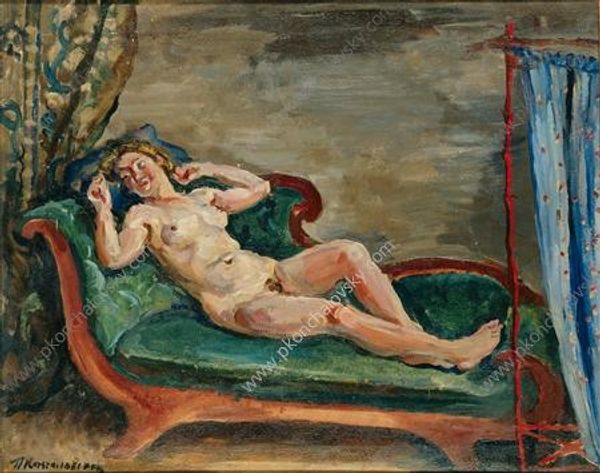 Editor: Here we have Iosif Iser's "Laid Back Nude," material unspecified. I'm immediately struck by the contrasts – the darkness of the background versus the luminosity of the figure, and the almost turbulent brushstrokes everywhere. How do you interpret this work? Curator: Considering the socio-political context, nudes, particularly those painted by male artists, often functioned as assertions of power and control over the female form. But Iser was working in the early- to mid-20th century, a time of significant shifts in artistic and social conventions. Do you notice anything in the way Iser has depicted the female body that seems to break from earlier traditions? Editor: I guess that while it's a nude, it doesn't feel… idealized. The pose feels casual, the expression seems almost pensive. There is vulnerability more than objectification. Curator: Exactly! Iser is seemingly less concerned with the male gaze, less inclined to paint for purely didactic or classical aesthetic purposes, which can be observed through the strokes and lack of focus on ‘perfection’ – perhaps instead commenting on more immediate sensuality. How do you think the rapid, visible brushwork contributes to this interpretation? Editor: It adds a sense of immediacy and perhaps challenges traditional academic art values? It gives it almost like an "unfinished" look. Curator: Yes. Consider how this might relate to the expressionist movement and its emphasis on emotional expression over strict representational accuracy and even challenge notions of beauty. In that context the “laid back nude” appears more liberated from tradition. Editor: So, in some ways, it reflects evolving social attitudes towards the female figure, moving away from simply objectifying them? I had never looked at a nude painting that way before. Curator: Precisely. It shows that an artwork that on the surface, may present one theme, upon closer inspection can convey much broader and deeper themes, with relation to the artwork's position in the grander scheme of historical development.