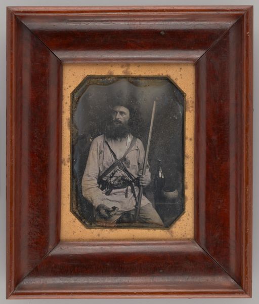 Editor: So, this is an untitled photograph, probably taken between 1839 and 1899, from the Art Institute of Chicago and created by an anonymous photographer. It has this sepia-toned portrait of a man and… something about the subject's expression feels distant and reserved to me. What do you make of this portrait? Curator: The portrait is more than a record of likeness; it serves as a powerful cultural symbol. Notice the man's attire – the jacket and hat with some heraldic insignia— and then reflect on photography as a medium emerging in the 19th century. Do you see a deliberate self-presentation here, a visual construction of identity meant to communicate specific social meanings? Editor: Definitely. It's interesting you call out the hat’s insignia—I hadn’t focused on that! It makes me think about status, maybe the photographer or subject was interested in marking the sitter's association with some particular institution or even a philosophical idea? Curator: Exactly! Symbols in portraiture of this era aren’t accidental; they reveal a complex interplay between the sitter’s personal aspirations and societal expectations. Consider how the man’s reserved demeanor and careful posing play into then-contemporary ideals of masculinity and social decorum. What emotional resonances might this portrait have carried for its original viewers? Editor: So it’s a way of seeing how people wished to be seen and remembered. It's a glimpse into their world and values. I appreciate your helping me think about these elements, especially how those historical meanings influence how we understand and experience the image today. Curator: And how these visual symbols persist and transform across generations.