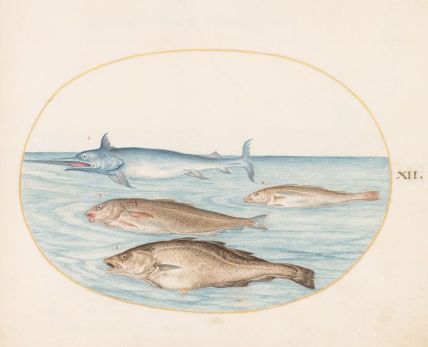 Curator: Today, we are looking at Joris Hoefnagel's "Plate 8: A Dolphin, Two Seals, a Brethmechin, and Shells," created circa 1575-1580. It’s rendered with colored pencil and watercolor. What are your initial thoughts? Editor: It's oddly charming. The colours are muted, but the detail given to the different textures, especially the scales on the fantastical brethmechin, is captivating. I'm immediately drawn to its materiality. Curator: Absolutely. And the Brethmechin itself speaks to a cultural moment where the boundaries between the real and imagined were constantly renegotiated. Its inclusion, alongside more naturalistic depictions of a dolphin and seals, points to a society grappling with understanding its place within the natural world, often blending empirical observation with folklore. It raises questions about power dynamics in terms of gender, questioning the social assumptions of Hoefnagel’s era in mapping human perception. Editor: Right. These aren’t straightforward scientific illustrations. There’s a clear emphasis on craftsmanship, on rendering these creatures with painstaking detail, which would require time, specific pigments and considerable skill. Where did these materials originate? How were they sourced and by whom? Who was this ultimately made for? Curator: This kind of art would appeal to wealthy patrons invested in natural philosophy and displaying the bounty of the natural world but it may also be used as a coded means to examine social anxieties about emerging class tensions in cities that are so heavily driven by trade. Editor: Interesting, and look at how the textures vary—smooth for the dolphin, coarse for one seal. The rendering is very evocative. What labor went into mixing those paints? The brushes were likely handmade. This tells us about value too. Curator: It does, indeed. Furthermore, what might the seashells arranged on the bottom edge of the panel tell us about global trade routes? How might this project the colonial intentions? What about those who were denied the ability to express themselves as free humans during that time? Editor: Precisely! The means of representation isn't neutral. And it makes me consider: what resources were allocated to create images like this versus those allocated to alleviate material suffering for others? Curator: It invites such necessary lines of questioning! Overall, looking at this today prompts us to confront the legacy of 16th-century thought, both in terms of its visual techniques, the material process, and what these elements meant, or mean now. Editor: Exactly, this is really such a complex rendering, not just pretty animals, and thinking about art’s production encourages us to re-evaluate so much about our relation to material, to labour, to capital, and really everything surrounding this plate.