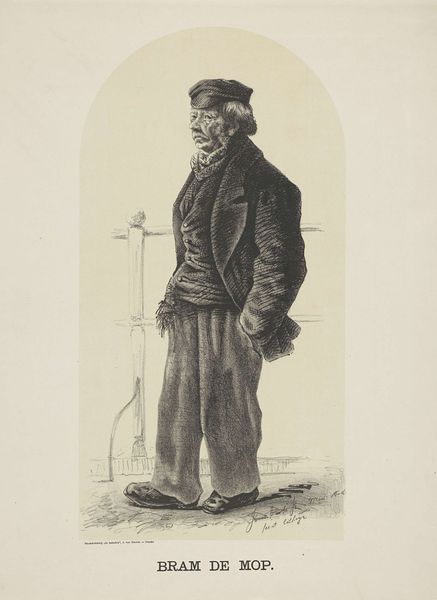Editor: This is "Standing Man with Hat and Walking Stick" by Georges Rouget, created in 1846. It’s a print currently held at the Rijksmuseum. I’m immediately drawn to the starkness of the figure against the plain background. The detail in the man’s clothing, the lines creating texture, contrasts with the simplicity of the rest. What strikes you about it? Curator: Note how Rouget masterfully employs line to define form and texture. Observe the dense hatching and cross-hatching, especially in the man's lower garments, that create a sense of depth. How would you describe the quality of the line itself? Editor: I’d say it feels very precise, controlled. Not fluid or gestural, but sharp and deliberate. Curator: Precisely. This control allows Rouget to articulate minute details—observe the furrows on his brow or the texture of the fabric. Ask yourself how the artist's use of varying line weights contributes to the overall composition. Editor: It guides your eye around the figure. Thicker lines define the outer edges and create contrast against the almost weightless shading inside the form, don't you think? Almost like he is carving out the silhouette. Curator: Indeed. Consider the relationship between figure and ground. The relative absence of background detail throws the emphasis directly onto the man. This sharp delineation emphasizes the flatness of the picture plane even while depth is suggested. A tension is created between two- and three-dimensionality. Editor: That's an interesting point; the flatness almost feels like a stage. Now, reflecting on it, I notice how Rouget uses the line to define the shapes rather than convey feelings or tell a story, putting pure form over narrative. Curator: An astute observation. Through his controlled line and composition, Rouget elevates the formal elements of the work itself.