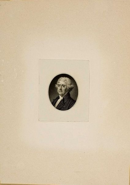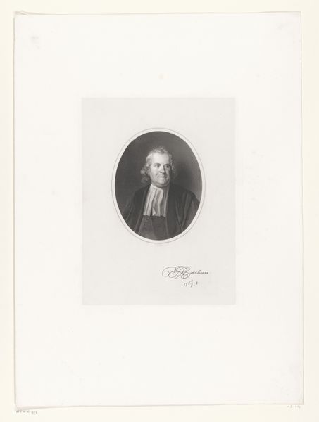 Curator: This etching presents a portrait of the theologian Herman Johan Royaards, dating from around 1834 to 1859. Editor: My initial impression is one of formality, perhaps even austerity. The oval format and monochrome palette reinforce this feeling. The texture appears subtle, not overly worked. Curator: Indeed, the limited tonal range, achieved through the etching process, creates a somewhat restrained atmosphere. The portrait's composition centers the subject within the oval, directing focus toward his features and academic garb. What semiotic elements do you observe that underscore his status? Editor: The collar, the gown, the subtle medal, it all speaks of a learned man, a professional. The production of such a portrait would be considered quite skillful for the period. Curator: Absolutely, there's a clarity in the etching style, capturing both realism and idealization. Consider how the interplay between light and shadow defines Royaards' face, lending him a noble and slightly aloof presence. It mirrors academic art's conventions. Editor: When looking at this, I also wonder about the availability and use of printed portraiture, not just for personal mementos but to amplify and democratize this type of professional presence at this time. The social function is quite powerful. Curator: A fascinating angle to consider, its relation to print culture in early 19th-century Dutch society. But look closely at the execution. Editor: Agreed. This wasn't merely an act of representation. The labor invested in the etching plate suggests an intentional elevation. One must also examine the quality and availability of etching tools and papers to truly understand the conditions under which this piece came into existence. Curator: Indeed, understanding the materiality sheds light on the value imbued to the subject, theologian Royaards. Ultimately, it gives the composition a deeper contextual resonance. Editor: Examining the materials provides just another facet to interpret social narratives. It reframes how we see not just the subject, but the value of knowledge at the time.
