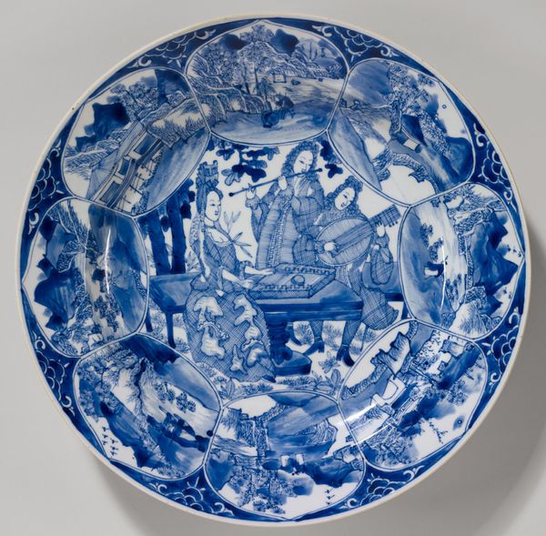 Editor: We're looking at a piece titled "Fruit Dish and Drainer" from the 1740s to 1770s, made by De Porceleyne Byl, utilizing ceramic and earthenware. The blue and white palette, with the central drainer section, gives it an elegant and almost delicate feel. How can we interpret the use of this style during its time period? Curator: This piece speaks volumes about the complexities of trade and cultural exchange during that era. What appears delicate on the surface hints at the economic and socio-political forces at play. Delftware, as this earthenware is often called, became a Dutch phenomenon precisely because of disruptions to Chinese porcelain imports. Editor: So, it was a local response to a global market shift? Curator: Exactly. Consider the Dutch East India Company, which brought Asian ceramics to Europe. When that supply was interrupted, Dutch potters seized the opportunity. They imitated the designs, but using local materials and techniques. This dish then isn't just functional; it’s a marker of colonial ambition and artistic adaptation. Look at the landscape imagery. Do you see any references that aren't quite… European? Editor: Yes! The figures in the scenes look vaguely Asian, or at least an idealized version of them. So, this artwork plays into and arguably perpetuates the idea of the "exotic" Orient, even in something as simple as a fruit dish? Curator: Precisely. The visual language serves a purpose. The "Fruit Dish and Drainer" becomes not just a beautiful object, but also an instrument, of constructing and disseminating cultural narratives and reflecting power dynamics of the era. It forces us to consider whose perspective we're seeing and who benefits from it. Editor: This completely changes my view! It’s incredible how a seemingly simple piece like this can tell us so much about the history and politics of its time. Thanks for pointing that out.