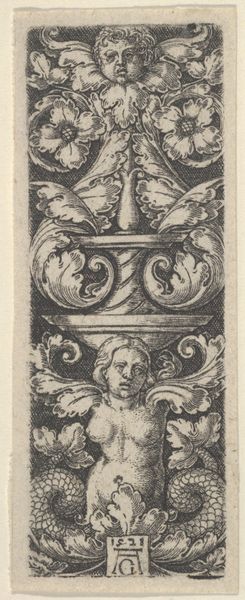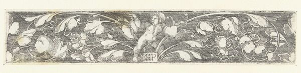 Curator: "Fries met drie medaillons," or "Frieze with Three Medallions," by the Monogrammist FG, circa 1530 to 1540. What is your initial reaction? Editor: My first impression is how ornate it is. A complex linear design with almost overwhelming detail, evoking a sense of classical extravagance on what appears to be a small scale. Curator: Indeed. The piece exemplifies Renaissance classicism. Note how the composition employs symmetrical arrangements and the idealized profiles within the medallions. Editor: Precisely. The engraving process would necessitate highly skilled metalworkers. One must consider the value judgements inherent in relegating utilitarian and even industrial processes as lesser crafts. What narratives were at play here in a highly competitive printing industry, when this artwork and others like it were being made? Curator: Consider how the allegorical components work on a symbolic level. The repetition, combined with the almost architectural form, may be construed to symbolize idealization, perhaps to indicate a continuous flow of an idea or lineage. It feels very self-contained, adhering to clear formal rules. Editor: The continuous frieze is certainly designed to create visual harmony across architectural space. Was it more luxury or practicality in the choice of materials during production? I wonder if that emphasis has shifted throughout history and curatorial decisions. Curator: A complex point. There is clear intentionality here to evoke specific emotions and convey symbolic meaning through formal arrangements and iconic imagery that transcends mere ornamentation. The rhythm itself is so well measured! Editor: It's compelling to imagine how it existed in the historical context, beyond the walls of a gallery or museum—what role the metalworkers, engravers, or printers saw themselves as contributing. Curator: Thank you, it offers a whole new angle to approach "Fries met drie medaillons". Editor: Agreed. And in doing so, hopefully, provides avenues of richer appreciation.