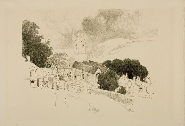 Editor: This is Eric Ravilious’s watercolor from 1938, "Duke of Hereford's Knob & Baptist Chapel at Capel-Y-Ffin." There's something so distinctly British about it; it evokes a really melancholic, almost haunted atmosphere. What historical forces do you think might be at play in shaping a scene like this? Curator: A pertinent question. Ravilious painted this on the eve of the Second World War. Considering this historical context, his choice to depict such a remote and quiet landscape speaks volumes. Britain at this time faced considerable socio-political uncertainty; how do you see that potentially manifesting itself in his aesthetic choices here? Editor: Well, perhaps in the focus on the rural, in trying to preserve this image of a simple, untouched Britain? Like a nostalgic counterpoint to industrialisation and the looming threat of war. Curator: Exactly! The rise of nationalism and the anxieties around cultural identity played a big part in promoting such imagery, both through government-backed initiatives and in the public imagination. The public role of art in wartime cannot be overstated. Consider, for example, the "Recording Britain" scheme around that period, a drive for artists to depict what they felt was distinctive about British towns and countryside before any potential destruction. Editor: That gives this landscape an added layer of meaning. I hadn't thought about that. Curator: Do you see how Ravilious, by aestheticising it and putting it on display, essentially transformed this quiet chapel into a potent symbol of Britishness itself? It shows how much power is at play in image making, particularly in those days. Editor: I’m starting to see how much the political climate shaped seemingly neutral landscapes. It’s much more than just a pretty picture. Curator: Indeed. Now look again and ask yourself: whose version of Britain is he presenting, and why?