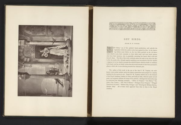 Curator: This is a photographic reproduction of a painting titled "Children Watching a Toy Boat in a Tub" by Thomas Webster, made sometime before 1873. Editor: It's amazing, this monochrome world within a book. I'm immediately drawn into the children's fascination, this contained moment of joy amidst the mundane. There’s something so intimate about it, like stumbling upon a cherished memory. Curator: Intimacy is key. The image is presented within the pages of a sketchbook or journal. The page opposite includes typeset text that contextualizes the original painting, grounding the work in both a material reality, and an artistic and historical framework. The presence of text lends it scholarly weight. Editor: And a poignant layer, perhaps, hinting at lost histories. Look at the faces—they are filled with pure, childlike wonder. And that tiny boat, sailing in its humble sea. One can imagine it as a vessel of grand adventures. I wonder about that feeling: is it better expressed through an image in monochrome? Or color? Curator: Colour would provide additional historical and textural details about the artist's intentions, and painting materials. Yet here, this muted presentation, allows for contemplation through time. These documents and art objects often circulated across great distances and diverse audiences. Their accessibility lies in this reproducibility. Editor: Reproducibility for all, and for those across time as well! Looking at this, it makes me think of childhood itself: a fleeting, black-and-white dream, constantly being reimagined through memory and art. It invites you to linger, doesn't it? To dwell on simple joys. Curator: Indeed, a testament to art's enduring capacity to transport us, to evoke nostalgia, and to democratize art's influence.