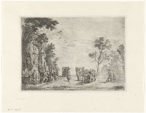 Editor: Here we have "Aankomst van Willibrord, 691," an engraving by Simon Fokke, created sometime between 1722 and 1750. It’s fascinating how detailed it is, even though it’s quite small. I’m immediately struck by the contrast between the pagan scene on the left and the arrival of Willibrord and his followers on the right. It's like two different worlds colliding. What do you make of it? Curator: Ah, yes! This image, you see, is more than just a historical record; it's a performance, a carefully orchestrated drama. Simon Fokke, bless his heart, is showing us a pivotal moment: the clash of beliefs. Look at the figures on the left, practically frozen in their ritual, and then this procession led by Willibrord, radiating, almost glowing, as if bathed in divine light. The ship sails in from foreign lands, but what lands, really, are these new thoughts charting. Do you feel the inherent tension, the charged air between the figures? Editor: I do! It’s palpable. The pagan worshippers seem almost fearful, while Willibrord looks so… serene. Is that deliberate, do you think? Curator: Absolutely deliberate! Fokke isn’t just documenting; he’s interpreting, guiding our eye, prompting us to take a side, to maybe… embrace the new. Engravings like this one were, at the time, a powerful vehicle for sharing information, influencing opinion, spreading this, uh, light to the masses. What's old can become new. Editor: So, it's not just about historical accuracy; it's about persuasive storytelling? Curator: Exactly! It's a baroque spin. Fokke invites us not just to observe the past, but to consider its implications and legacy. I am very grateful to see the Rijksmuseum preserve this history. Editor: That’s a fascinating point. I’ll never look at a historical engraving the same way again!