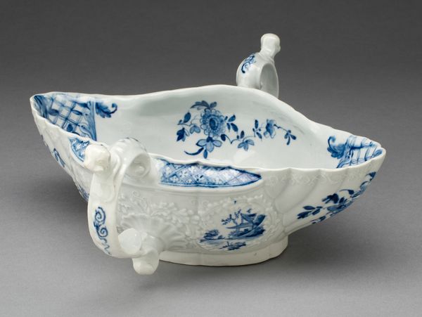 This porcelain tureen was created by the Worcester Royal Porcelain Company. The eye is immediately drawn to the stark contrast between the pristine white and the deep cobalt blue. The form is sensuous, with the curves of the bowl and lid offset by angular handles and a dragon finial, all creating a visual rhythm. The surface of the tureen is a dense network of patterns, from the overall embossed texture to the intricate blue painted scenes of figures and landscapes. These narrative scenes, carefully placed around the tureen, invite the viewer to engage with the object on a deeper level. There is a clear intent to create an object that is both decorative and functional. The strategic use of blue on white creates a semiotic interplay, evoking both classical European porcelain traditions and the influence of Chinese blue and white ware. This tureen embodies a dialogue between cultures and the aesthetic values of its time. It encourages us to question the boundaries between art, craft, and cultural exchange.