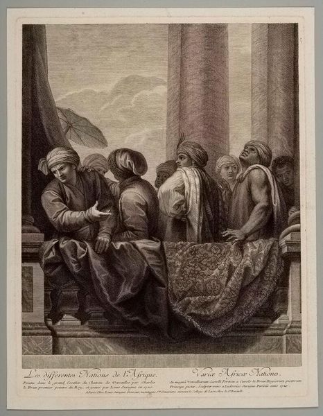 Curator: Louis Surugue's "Different Nations of America," created around the early 18th century, presents an intriguing, albeit problematic, view of the Americas. Editor: The first thing that strikes me is its almost theatrical composition, this group of figures arranged like a stage tableau, the imposing columns in the background... it has a certain grandiosity. Curator: Indeed. This work functions as a visual document of European perceptions, shaped by colonial narratives and the power dynamics of the era. Note how the figures are generalized, almost allegorical representations. Editor: Yes, there’s a clear hierarchy being established here. The central figure, possibly meant to represent an "American" ruler, is posed in a way that is immediately reminiscent of European monarchs. Curator: Precisely. And consider the "nations" depicted – their identities are homogenized, stripped of cultural specificity, reinforcing a Western gaze that seeks to categorize and control. The ship in the background is not by accident either. Editor: I find it difficult to view this without questioning its role in perpetuating harmful stereotypes and in serving as a justification for colonial expansion. Curator: Absolutely. It reminds us that art is never neutral; it's always enmeshed in complex social and political contexts. Editor: A stark reminder of how the past informs the present, shaping our understanding of identity and power.