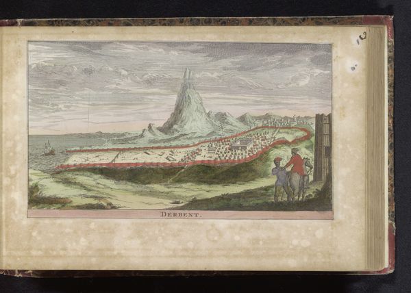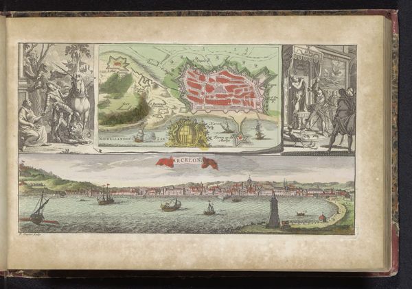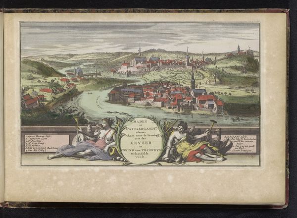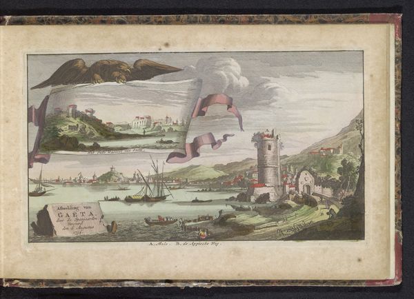 Curator: What a find! This delightful image is a baroque-era print, probably enhanced with watercolor, called "Gezicht op Neuchâtel," or "View of Neuchâtel," dating back to 1735. The artist remains anonymous, which only adds to the mystique. Editor: It has an airiness about it, almost dreamlike. The pastel colors and detailed cityscape give the impression of peering into a fairy tale town. Curator: Absolutely! The panoramic view, captured from slightly elevated ground, positions us, the viewers, as almost benevolent observers. Editor: Except who exactly is doing the viewing? The inclusion of cupids in the lower-left foreground seems so strategically placed, suggesting a rather insidious voyeurism—inviting the predominantly white and male gaze toward an objectified "Neuchâtel aan Zee." Curator: A keen observation! Though, the cupid themselves seem almost oblivious, preoccupied with unfurling the very banner that announces the town's name. There's an undeniable theatrical quality about them—they beckon to be the part of the show. Editor: But it also performs, whether the artist intended it or not, a whole discourse of what Mary Louise Pratt called "imperial eyes"—producing and framing the "distant scene" for western consumption and authority. Look how they are also juxtaposed to indigenous population from this place! It is fascinating indeed! Curator: I agree. There's an overt embrace of the picturesque— the winding roads, quaint buildings clustered within protective walls, the sailboats gently gliding along the lake… It is almost a propaganda for what idyllic life of a small bourgeoisie looked like. Editor: A carefully crafted tableau. And even that heavy cloud hanging ominously overhead feels almost deliberately positioned to amplify this idealized tranquility through contrast. It subtly enhances our yearning for such "peace". Curator: Precisely. The use of delicate, almost fragile line work to depict these architectural details imbues the city with a certain charm and permanence. Editor: It certainly evokes a world in transition, doesn't it? And makes me appreciate how complex it really is, even while looking at what looks like a simple image! Curator: Absolutely, art always surprises us, doesn't it? It may evoke at the very beginning a first simple thought but in time unveils hidden layers and profoundity in interpretation.