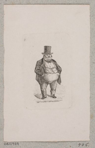 Curator: At first glance, the drawing gives me a somber mood; I find the composition and subtle details quite striking. Editor: Indeed. What we have here is a piece titled "Prof. Meisling," attributed to H.P. Hansen, dating somewhere between 1829 and 1898. It is currently held at the SMK, Statens Museum for Kunst. It's a fine example of an engraving printed on what appears to be drawing paper. The labor involved is apparent, isn't it? Curator: Absolutely. You see this figure, clutching an umbrella and sporting a twig in his mouth, positioned so stiffly in a drawing. Considering the era, it prompts reflection on societal expectations surrounding male representation and the rigid constraints they placed upon self-expression. This is particularly potent if the subject was a public figure of the time. Editor: The rendering reminds me of the detailed work put into banknotes—all those fine lines. Look at the cross-hatching employed to define his coat. The means of production and availability for the general public play an important role in assigning a historical value to this print. I imagine countless copies circulating after the initial plate was created, each one imbued with its own aura through material transformation and dissemination. Curator: I wonder how Hansen perceived Prof. Meisling. Was this commissioned, a piece meant to glorify him? Or a satire, mocking the bourgeoisie? The almost comical rendering invites critique of class structures during a period defined by emergent capitalism. The attire, the stick—symbols ripe for dissecting power and privilege. Editor: Regardless of Hansen’s intentions, there’s an inherent truth exposed within its making: the labor of the artist translating social hierarchies into tactile lines upon paper. To replicate a recognizable human figure and convey ideas via an engraver's tools is an incredible exercise in itself, showing not only material handling but technical acuity, too! Curator: Precisely, examining through the lens of material conditions brings us back full circle—linking representation and production under a larger social context. It highlights our cultural understanding of social standing reflected through, or constructed by, an artistic piece like this one. Editor: Well said! Analyzing production unveils more stories than purely iconographical analysis. Food for thought.