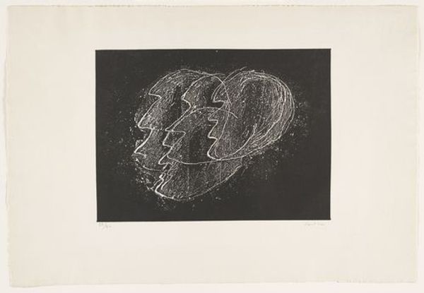 Curator: This is Jean Fautrier's "Hostages on a Black Ground," currently held in the Tate Collections. Editor: It's raw, violent even. Like scratches on a dark window, barely hinting at forms beneath. Curator: Fautrier's work often confronted the trauma of World War II, the Nazi occupation, and the atrocities committed. "Hostages" is part of a series directly addressing these events. Editor: Knowing that context explains the brutality. It's not just marks on paper, it's a material testament to suffering, to the act of bearing witness through ink and plate. Curator: Absolutely. He uses abstraction to convey the unspeakable, forcing viewers to confront the emotional impact of the war. Editor: Fautrier uses the printing process to create an experience akin to viewing the darkness of the war. Curator: It's a potent reminder of the role art plays in confronting difficult histories. Editor: Yes, and it pushes us to consider the social implications of material culture.
