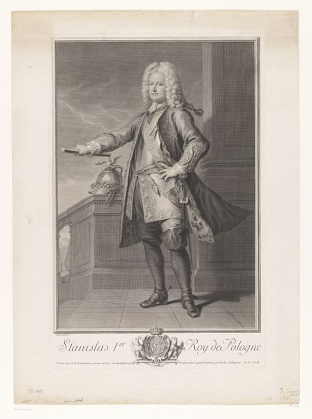 Curator: This is a Baroque engraving from 1753 by Johann Martin Bernigeroth, currently housed in the Rijksmuseum. It’s entitled “Portret van Michael Leube." Editor: My first impression is one of contained opulence, with a touch of the scholarly about it, wouldn’t you say? There's a definite hierarchy present in the visual planes of the engraving. Curator: Absolutely. Considering Leube’s societal standing at the time, the details of dress become pivotal. Lace was particularly inaccessible and became a blatant status symbol due to the time and skill involved to craft the material. This image actively projects Leube’s access to financial stability but moreover his role in society as a figure of power. Editor: Notice the exquisite detail in the rendering of fabrics, especially in the way light plays across the velvet of his coat. It draws the viewer's eye but it also invites the viewer into an interpretation of Leube. The technique, specifically, contributes significantly to the portrait’s overall feeling of importance. Curator: The framing around Leube's figure subtly nods to his historical moment and is interesting to consider given the cultural context of its creation and our modern sensibilities. As an advisor to the Saxon Court, his dress codes become visual cues about a person in a position of power. He exists very much within the systems he is beholden to. Editor: The artist uses line and contrast brilliantly, creating a compelling play of dark and light that sculpts Leube’s face and gives him such presence, it really feels like an immediate invitation. He certainly commands attention through the technical execution alone. Curator: Thinking of the time the work was created helps me consider how power operated in relation to presentation. Leube is intentionally demonstrating what he stands to offer the public through this type of image. It also reminds us that portraiture served a much different function than perhaps it does now. Editor: And by appreciating the artist's formal choices and how they guide our attention, we gain a much richer and much more thorough appreciation for the subject but also the historical and aesthetic function. Curator: Agreed. Examining art in relation to identity, power, and historical positioning unveils insights that help challenge what is communicated, allowing room to further analyze through differing vantage points.