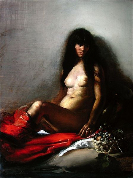 Kun Wang’s painting “Red Rhythm” captivates us with its dark background, in contrast to the light, muted skin of the subject and the saturated red fabric on which she stands. The arrangement creates a visual experience dominated by colour and texture. Consider how Wang orchestrates these contrasts to engage with classical ideas about beauty and form. The softness and subtle gradations in the model's skin and features highlight her body as a site of meaning. This traditional subject is destabilized by both her natural pose and the fabric beneath her feet: a stark splash of colour interrupts the painting’s subdued palette, challenging conventional norms with the very bold use of form. Note how Wang's composition employs a visual strategy that merges tradition with a contemporary sensibility. It does not present a fixed idea of beauty, but rather an ongoing dialogue about representation.