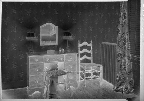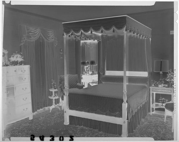Editor: This black and white photograph by Martin Schweig presents a bedroom interior. The twin beds and floral wallpaper evoke a sense of domesticity. What structural elements strike you in this image? Curator: The photograph's strength lies in its composition. Notice how Schweig uses contrasting textures—the smooth bedspread against the busy wallpaper—to create visual interest. The geometric forms of the furniture juxtapose against the organic floral pattern. How do these formal choices affect your interpretation? Editor: I see how the contrasting textures add depth and visual interest. I hadn't thought of it that way before. Curator: Indeed, Schweig masterfully arranges these elements, transforming an ordinary scene into a study of form and light. The picture plane is bisected by the symmetry of the beds, yet asymmetry emerges through the placement of objects. A successful arrangement, wouldn't you agree? Editor: Yes, I appreciate how a simple photograph becomes so much more through formal analysis.