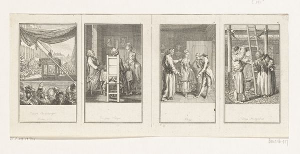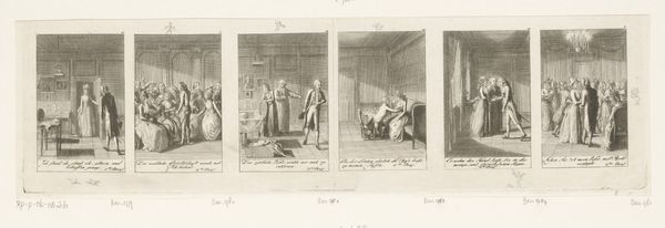 Editor: So, this is "Zes voorstellingen uit Müller's Siegfried von Lindenberg" by Daniel Nikolaus Chodowiecki, created in 1783. It’s an engraving printed on paper, showing six scenes. It's incredibly detailed but feels… almost like a set of mass-produced illustrations. How would you approach this work? Curator: From a materialist perspective, the reproductive nature of this engraving is key. Consider the labor involved: the artist designing, the engraver translating the image to the plate, and then the printing process itself. Each step necessitates specific skills and tools. How does the fact that this image could be reproduced and widely distributed change its meaning? Editor: It feels less precious, more accessible? More like a commodity than a unique object of veneration. Curator: Exactly. And look at the depicted scenes themselves. They narrate a story, likely from a popular text. The choice of engraving as a medium allows for a wider audience to engage with the narrative. Consider the relationship between artistic production and literacy. Were these prints intended for a wealthy elite or a broader segment of society? What can the depicted subjects, settings and costumes reveal about this historical period? Editor: So, it’s less about the inherent beauty, and more about how it reflects the culture and technology of its time? The way images are made impacts who they're for and what they communicate. Curator: Precisely. The means of production dictates the consumption and interpretation. By examining the materials and process, we gain insight into the social context in which this artwork was created and consumed. Notice how the artist carefully details the costumes. What social class would wear these garments? Editor: I guess, understanding how these engravings were made and circulated helps reveal what life was like then. I never really considered how important the material production of art can be! Curator: Indeed, and it encourages us to think critically about the relationship between art, labor, and society, now and then. Thank you for exploring this piece with me!