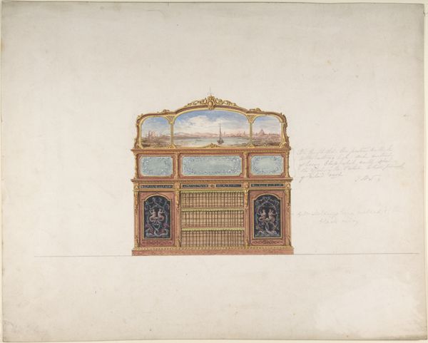 Joseph Nussbaumer’s design for a secretaire presents us with a symphony of architectural precision and vibrant color. Executed in ink and watercolor, the drawing’s tripartite structure immediately draws the eye: frontal view, cross-section, and plan view, each rendered with meticulous detail. The secretaire itself, dominated by a robust red hue, is crowned with a miniature classical facade complete with columns and an arched niche. This architectural mimicry is not merely decorative, it plays with scale and form to challenge our perception of furniture as purely functional objects. The cross-section to the right, rendered in cooler tones, offers a ghostly counterpoint, exposing the secretaire’s internal logic and construction. At the base, the plan view provides a glimpse into the imagined space it would inhabit, adorned with geometric patterns and subtle color accents. Nussbaumer's design engages with broader discussions about domestic space, functionality, and the integration of classical ideals into everyday life. This tension between utility and architectural grandeur makes the design an object of aesthetic contemplation, not just a piece of furniture.