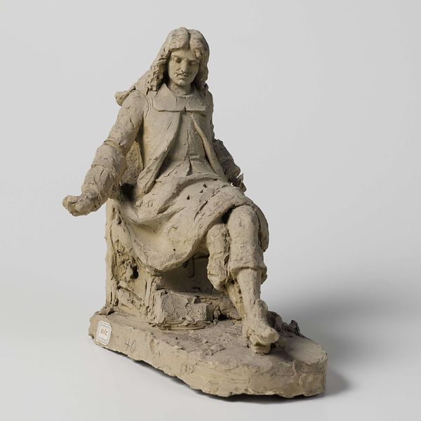 Curator: Today we’re examining "Hoop," a wooden sculpture crafted in 1776 by Willem Hendrik van der Wall. It is an example of Baroque sculpture. Editor: It gives me a feeling of arrested motion. The figure’s posture implies a journey, perhaps interrupted or prematurely ended. Curator: Note the artist's deliberate manipulation of form. See how the cascading drapery, meticulously carved, creates an interplay of light and shadow, drawing the eye across the sculpture's entirety. Van der Wall skillfully employs contrapposto, with a marked twist in the figure’s torso, which introduces dynamic tension into an otherwise static object. Editor: The flowing drapery, to me, recalls representations of figures caught in spiritual ecstasy or divine annunciation. The missing arm almost amplifies this sense of urgent but incomplete communication, leaving us to fill in what's not visible. There's a sense of reaching for something, a longing perhaps, that lingers with the viewer. Curator: Interesting. I perceive the missing arm more as a structural absence, subtly altering the equilibrium of the work. The void disrupts an otherwise symmetrical composition. Look at the roughly hewn base. It's hardly integrated; the piece demands further formal refinement to establish resolution. Editor: Even in its apparent state of disrepair, I feel there's a powerful symbolism at work. Think of ancient sculptures unearthed with missing limbs. It makes us consider notions of fragility, loss, and even the inevitable decay that all earthly creations must face. It evokes an understanding of transience, of mortality, wouldn't you say? Curator: A potent argument for considering cultural context. However, when observing "Hoop", I find most compelling the intrinsic relationships between its formal components – planes, curves, the grain of the wood itself – as the heart of the artwork. Editor: Well, either way, the enduring resonance of "Hoop" speaks for itself! Thank you for joining me today to ponder this exceptional piece of sculpture. Curator: An insightful experience for us all.