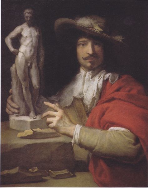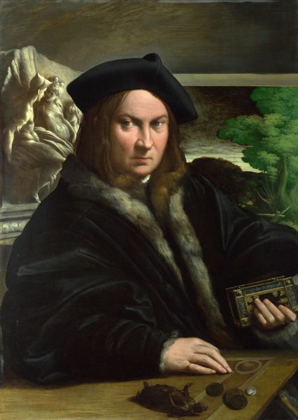 Tommaso Fiorentino painted this "Portrait of a Man" in the 16th century, most likely using oil paint on a wooden panel. The real artistry here lies in the masterful handling of oil paint to mimic luxurious fabrics and textures. Note the painstaking depiction of the man's garments, his sleek black hat, and his delicate, pleated shirt. These details weren't just about showing off wealth, but also Fiorentino's skill in capturing the tangible qualities of cloth. Paint wasn't just a medium for representation; it was a means to evoke a sense of material presence, giving this portrait a powerful connection to the world of textiles and commerce. The high level of artistry elevates the artist from craftsperson to fine artist, challenging the distinction between art and craft.