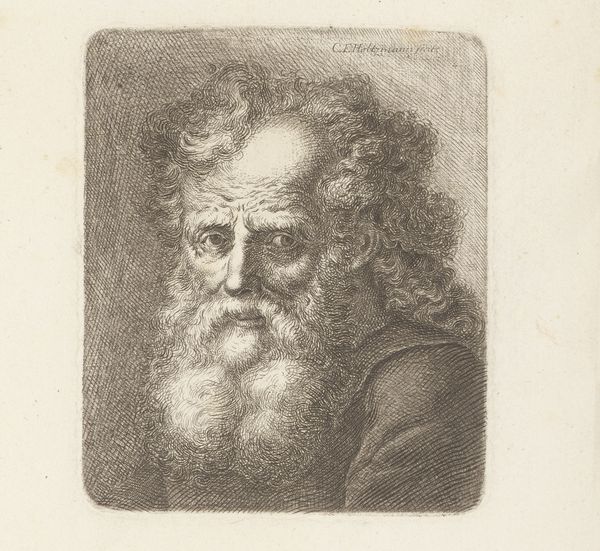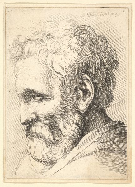 Curator: Immediately striking is the intense, almost melancholic gaze. He seems weary, burdened perhaps by time itself. Editor: Indeed. What we have here is Wenceslaus Hollar's "Head of an old man with a large beard", created in 1645. Hollar, known for his detailed etchings, masterfully captures the textures and subtle emotions. It’s currently held at the Metropolitan Museum of Art. Curator: That’s an excellent introduction to the artist. Seeing those swirling lines forming the beard, I think about the archetype of the wise elder, a figure prominent across cultures. That visual representation, a cascade of experience flowing downwards towards the chest. Editor: The use of etching gives the image a particular depth, almost a tactile quality. Baroque portraiture often explores grand themes and idealised forms, but Hollar's study brings it down to the individual and focuses on wrinkles, texture, and even age as defining attributes of character and identity. This wasn’t always considered dignified, of course. It asks viewers to reconsider the narrative surrounding experience and ageing. Curator: Considering Hollar's historical context, was this depiction an act of rebellion, showing what powerful can emerge from vulnerability? Editor: Precisely. Notice how the face dominates almost the whole frame, pushing it close. The intense stare transcends the print itself to implore the viewer. But notice that the light in his eyes is sharp; I detect the inner resolve despite external lines of age and possible oppression, suggesting resilience and defiance. Curator: Perhaps this figure resonated with others in Hollar's era navigating change. It also makes me consider our culture’s approach to ageing: are we doing as well now at honoring individual struggles for human existence through challenging experiences as this one, created almost 400 years ago? Editor: It’s hard not to consider our world’s obsession with the idealized image that stands so starkly against Hollar’s tribute. I believe this work pushes against that grain. Curator: Seeing that shift towards acknowledging lived experiences feels increasingly relevant now.