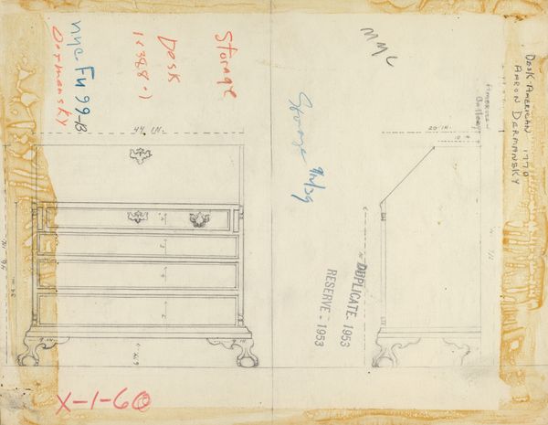 Editor: This intriguing pen and ink drawing on paper is titled "Briefkaart aan anoniem," or "Postcard to Anonymous," created sometime between 1892 and 1938 by Richard Nicolaüs Roland Holst. Its simplistic nature piques my curiosity. What do you see in this piece? Curator: Indeed. Immediately, the stark geometry captures my attention. The work is fundamentally about form, and how line defines space. Note the repeated vertical lines, interrupted by the horizontal, creating a series of rectangles, a study in structural organization. Consider how the artist employs hatching in the lower register to create areas of darker tonality, offering a textural contrast to the open expanse above. Editor: The lower section almost appears like a foundation to the taller rectangle. Do you think the calculations on the top right have significance to the overall piece, or are they simply a note? Curator: It is not simply what it depicts but how it is constructed that holds interest. One can ask how these additions contribute to the reading of the picture, if at all, but our focus lies firmly in understanding its structural components. How the interplay between lines affects the aesthetic properties on display, as the spatial relations become the very subject of the work. What if, as suggested, these shapes are the aesthetic experience themselves? Editor: So, we focus not so much on any potential meaning the forms might suggest but how they interact on the page. That's really interesting to consider. I often lean into symbolism, but focusing solely on composition opens up a whole different way of appreciating the piece. Curator: Precisely. Stripping away external narrative allows a more refined engagement with its inherent visual language. We leave the artwork as an aesthetic, semiotic tool.