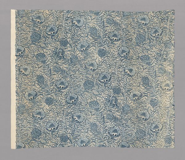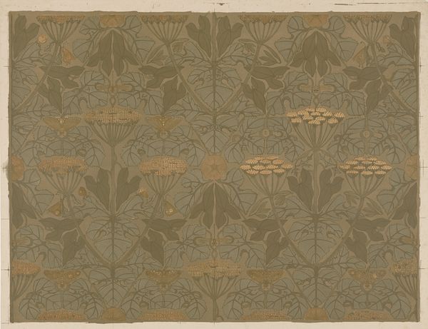 Curator: Before us, we have "Bespanningsstof met patroon van schermbloem en vlinders binnen spitsovalen" – a textile by Theo Nieuwenhuis, created sometime between 1909 and 1924. Editor: My immediate impression is of cool restraint. The blue-grey palette gives the piece a calm, almost subdued elegance despite its intricacy. Curator: Indeed. Note how the artist utilizes pointed ovals to contain umbelliferous flowers and butterflies, establishing a compelling geometric rhythm. The composition balances naturalistic motifs with stylized abstraction. Editor: It's interesting to consider this textile as an object of labor. Nieuwenhuis's design would have necessitated considerable technical skill in the weaving or printing process. The creation of the dyes, the preparation of the fabric… it speaks to the complex systems that support decorative arts. Curator: Precisely. The strategic deployment of these botanical and zoomorphic forms also invites semiotic analysis. What statements are being made through these visual signifiers? Editor: Perhaps a statement of control, or of framing nature to domesticate it. The repeating shapes act like a mold imposing order on organic, potentially chaotic forms. But it could also just represent commercial priorities and accessibility – a ready-made pattern intended for middle-class households, with less concern for challenging high art boundaries. Curator: It would be intriguing to examine the social climate of its creation to further appreciate the intent. I would wager a thorough consideration of contemporary critical discourse surrounding decorative art and its perceived hierarchy could provide new pathways to understanding the piece. Editor: Absolutely. The physical qualities matter too; understanding the weave structure, the type of dye, and the fiber content gives us an important material connection to the era and artistic purpose of this lovely patterned design. Curator: Considering the object through a multifaceted lens allows for enriched perception. It is satisfying when theory is grounded within palpable, material considerations. Editor: I agree. Studying the work provides so many threads with which we could unravel assumptions regarding production and art.