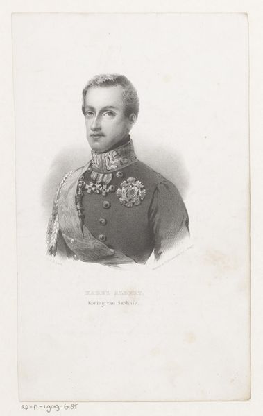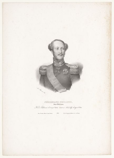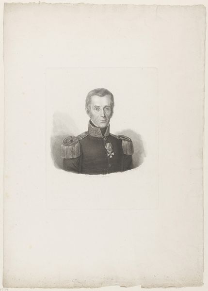 Editor: Here we have Antoine Maurin’s “Portret van Louis Charles Philippe Raphael van Orléans, hertog van Nemours,” created in 1839 using pencil and engraving. It's remarkably detailed for such a delicate medium. The textures, especially in the uniform, really stand out. What initially captures your attention about the piece? Curator: I find the interplay between the linearity of the engraving and the softer tonal gradations achieved with pencil quite compelling. Notice how the artist uses hatching and cross-hatching to build up the form of the Duke’s face and clothing, creating a sense of volume despite the monochromatic palette. Editor: So, the way he’s used the lines, even without color, gives us the depth and texture? Curator: Precisely. The formal arrangement creates its own representational language. Consider, too, how the light falls—or, rather, is suggested—across the figure. Maurin utilizes varying pencil pressure to articulate the highlights and shadows, thus establishing the figure's presence within the pictorial space. Do you find the formal qualities harmonise with, or detract from, the subject matter? Editor: I hadn't thought about that dissonance. Perhaps the rigid formality inherent in the style reflects the constraints of royal portraiture? The details in the uniform are very meticulous! It’s really the sum of all these careful considerations. Curator: Precisely. By attending to these formal relations—the contrast between the linearity and the tonality, the play of light and shadow—we can begin to appreciate the artist's meticulous construction of the image, revealing something previously unforeseen! Editor: I completely agree! Looking closer at the technical elements really deepened my appreciation.