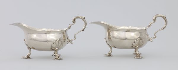 Curator: Here we have a pair of double-lipped sauceboats crafted by Thomas Farren, active in the early 18th century. Editor: Their fluid lines give them a distinctly Baroque feel, the light reflecting off the silver surface. Curator: These sauceboats offer a glimpse into the dining habits of the wealthy. Silverware was a status symbol, reflecting a family's economic standing. Editor: Note the carefully sculpted handles and the subtle engravings. These details elevate what would otherwise be a simple utilitarian object. Curator: Indeed, the material itself is significant. Silver, unlike earthenware, doesn’t absorb flavors, ensuring the purity of each sauce. Editor: Beyond that, the very shape and size seem perfectly calibrated for the sauces of the period. You can almost taste the rich gravies they once held. Curator: It’s a testament to the skill of craftsmen of the period. Their labor produced objects of beauty and luxury. Editor: Yes, and what elegant forms! It’s a simple object, but it tells a rich and interesting story about the culture that produced it.