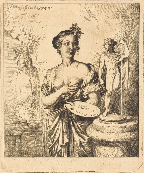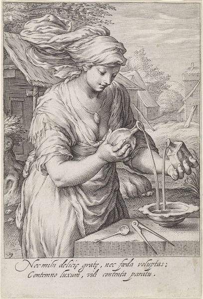 Curator: Wenceslaus Hollar’s engraving, “Portret van Lavinia Vecellio,” dating from 1650-1651, presents a striking figure. Editor: It does feel strangely...stilted. The subject’s pose, with that tray, is unnatural. There’s a certain artificiality about it. Curator: It's worth remembering that Hollar, a prolific printmaker, wasn't necessarily aiming for pure realism. His works often served to document and disseminate images of artworks from other mediums, like paintings. Editor: That adds a layer to it, doesn’t it? Considering its Baroque styling, this piece makes me question female representation and artistry. How much agency did Lavinia have in the portrayal, or was this entirely shaped by male perceptions of her at the time? The overt display, the passive gaze—it all contributes to a rather uneasy viewing experience from a modern perspective. Curator: The context, of course, is critical. Consider the artistic landscape of the time, dominated by patriarchal structures and notions of idealized beauty. Further, let us reflect on the socio-political status and limitations placed upon women during that era. The Rijksmuseum holds it now; this portrait probably served purposes within the social milieu of its creation, like conveying lineage or status. The material conditions of women determined in very real ways their presentation in art. Editor: Exactly. While technically impressive—the lines of the engraving are remarkably detailed—I’m more drawn to dissecting what this portrait *means* within that context. Was it subverting those expectations, or reinforcing them? Is there any evidence of a woman artist's influence here or some collaboration in determining representation? We can’t divorce the artwork from the systems of power it exists within. Curator: Indeed. That dynamic tension, between artistic achievement and its relationship to power, renders this print more than just a record—it’s a social document in itself. Editor: Ultimately, “Portret van Lavinia Vecellio” reminds us how vital it is to maintain critical, contextual sensitivity when looking at art from the past. What begins with Hollar ends with us as viewers taking account of structures and processes to be aware of the legacy.