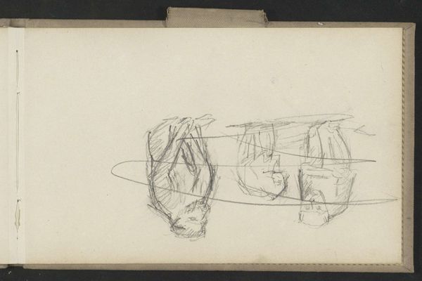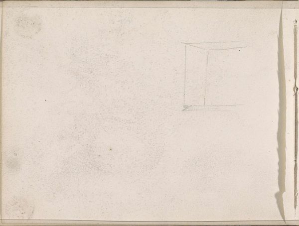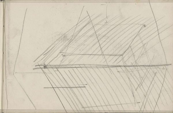 Editor: Here we have "Vooraanzicht van een huis met een puntdak," or "Front view of a house with a pointed roof," created sometime between 1892 and 1913 by Bramine Hubrecht. It's a pencil drawing on paper, currently held at the Rijksmuseum. What immediately strikes me is its raw, almost diagrammatic quality. What do you see in this piece, looking at it formally? Curator: Initially, one is compelled to address the materiality. Observe the texture of the aged paper; it presents a stark contrast to the fragile and tentative lines of the pencil. This creates a formal tension between permanence and ephemerality. Furthermore, consider the structural framework—the lines don't merely depict a house but rather delineate a geometric exercise. Do you observe the implied shapes? Editor: Yes, now that you mention it, I see a strong emphasis on triangles and rectangles. It’s like the artist is breaking down the house into its most basic components. Curator: Precisely. The composition privileges these forms, inviting a reading of the artwork as an exploration of architectural syntax. The drawing is more concerned with structure than representation. Hubrecht explores how architectural forms can be abstracted through lines, angles, and the interplay of geometric shapes. What conclusions can you draw about the intended message from this strategic breakdown of architectural language? Editor: That's interesting... Perhaps it suggests a focus not on the house itself, but on the fundamental principles of construction and spatial relationships? Curator: An astute observation. Formal analysis reveals an almost analytical approach, a reduction of the domestic to a study of shape and form. I would say my understanding has also expanded seeing a complex structure represented in simple lines, encouraging further examination and prompting introspection. Editor: I see the structure that was always there too, and this helped simplify what my mind could not parse initially. Thanks!