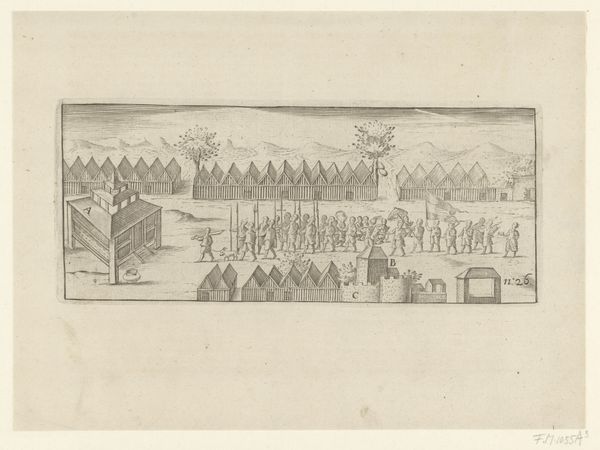 Stefano della Bella created this print, "Torchlight Procession at the Modena Carrousel" using etching, a printmaking technique that involves using acid to cut into a metal plate. The fine lines you see were achieved by drawing through a waxy ground applied to the plate, then immersing it in acid. The acid bites into the exposed metal, creating grooves that hold ink. The plate is then wiped clean, and the ink is transferred to paper under high pressure, resulting in a mirror image of the original design. Consider the skill involved in crafting such a detailed image through this indirect process. Note how the lines vary in thickness and depth, creating a sense of light, shadow, and movement. The procession almost seems to flicker with the light from the torches. This print wasn't just a picture; it was a carefully crafted object, requiring both technical expertise and artistic vision. It underscores the value placed on skilled handwork in a pre-industrial age, where artistry and labor were closely intertwined.