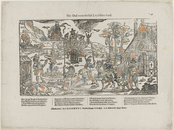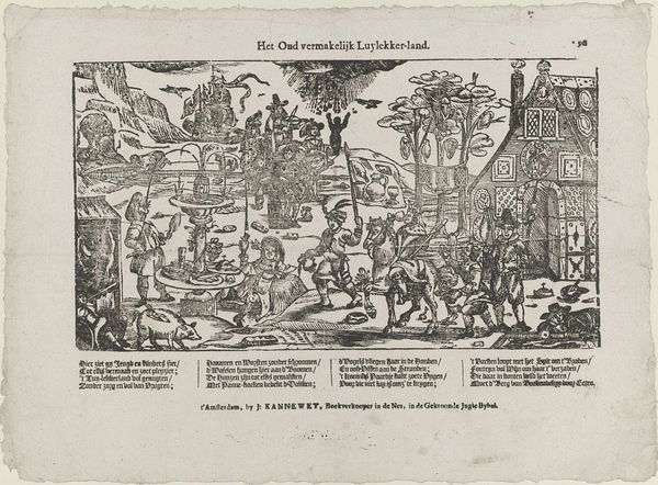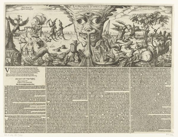 Curator: This engraving, titled "Allegory on the Role of the Pope in the Jülich-Cleves Affair, 1615," was created in 1615 by Nicolaes van Geelkercken and it is currently held at the Rijksmuseum. Editor: It's a fascinatingly busy composition. My immediate sense is of conflicting energies, with war juxtaposed against… is that a leisurely boat ride in the background? Curator: Precisely. This artwork really embodies the tumultuous socio-political atmosphere surrounding the Jülich-Cleves succession crisis. It functions as propaganda, doesn’t it? It criticizes papal involvement in political affairs by illustrating religious figures steering conflict for political gain, which were viewed unfavorably in the Dutch Republic at the time. Editor: I find the printmaking process itself crucial here. Engraving allows for intricate detail but also mass production. Its accessibility meant such potent visual rhetoric could permeate public consciousness in ways other mediums couldn’t. It suggests that public sentiment toward papal interventions may have been rather sensitive and politically volatile. Curator: The allegory plays a key role, as it employs easily recognized symbolism to get across its points. For instance, the Pope’s prominent placement implicates his central, problematic role in the Jülich-Cleves succession, and is not very subtly rendered with that gaze. Editor: I'm interested in the sheer density of figures. Look at those soldiers massed on the left, their spears a forest of implied violence. How do you see that level of detail impacting contemporary viewers? The chaotic elements within its otherwise neat construction suggests a feeling of societal disorder. Curator: I believe its density underscores a period defined by unrest and widespread socio-political manipulation—which can feel so modern, really. This piece highlights not merely historical events but broader criticisms related to authority and influence. Editor: For me, focusing on production brings another dimension. Consider the workshop producing these prints: the skills involved, the economic structures that supported it… These elements are easy to overlook but fundamentally shape our understanding of the image itself. Curator: It's truly a multifaceted artwork. Thank you, I can never deny the potent socio-political role artwork had during this time. Editor: Absolutely, thank you. And seeing art not only as imagery, but as artifact is very useful to considering its place in history.