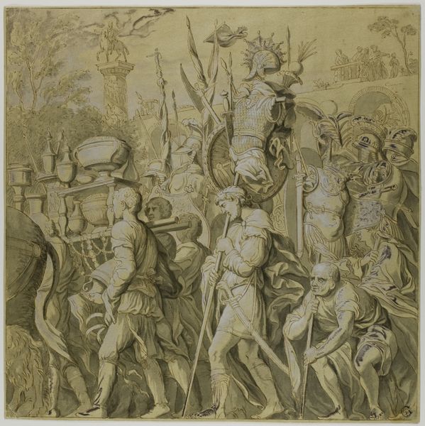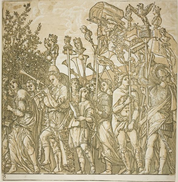Curator: Here we have Andrea Andreani's "Triumph of Julius Caesar," made in 1599. You can see it in the Rijksmuseum today. Editor: Well, isn't that just gloriously grandiose! All those figures packed in, almost bursting out of the frame, like a Baroque prelude! It’s teeming, I tell you, absolutely teeming. Curator: Exactly! It captures a monumental procession, doesn't it? What is particularly fascinating to me is how it embodies the artistic and political ideals of the Italian Renaissance through printmaking. Andreani cleverly used chiaroscuro woodcut techniques, playing with tone blocks, to create such depth. The medium itself reflects broader trends in making art more accessible during the time. Editor: It makes me wonder about the source blocks he used, all those separate bits of wood required for a print this scale. The labor and craft that go into each stage! Think about the quality of paper needed to render each successive impression and consider the accessibility factor within limited run size versus the sheer demand across 16th century Europe! Curator: It feels intentionally grand, as it links Caesar’s victories with aspirations of European power—timeless and very deliberate! All the trumpets, the trophies, it echoes through time. Doesn't it strike you as aspirational? Editor: Sure, but let's also ask *who* is able to *aspire* and *how* here? What were the lives and experiences of those unnamed laborers versus those wealthy enough to adorn the page with this narrative of 'conquest' from a seat of privilege? It’s all connected! Curator: A poignant thought! This print, with its depiction of historical power and skill, still invites different interpretations of what history and artistic legacy really entail. I’m left with how layered it truly is! Editor: Exactly! The triumphal imagery makes me ponder what isn't shown and who isn't celebrated in our archives! A material interrogation demands we hold up *both* sides of a ledger or risk historical pastiche at best.