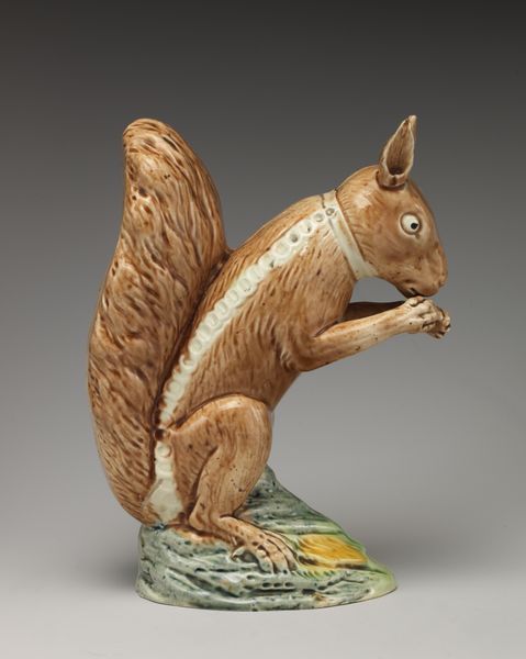 Curator: Looking at this piece, my first impression is of delicate exuberance. Editor: Indeed! Here we have a porcelain sculpture of a Squirrel, crafted between 1750 and 1760 by the Chelsea Porcelain Manufactory. It currently resides at the Metropolitan Museum of Art. Curator: The posture of the squirrel is fascinating—almost anthropomorphic. The way it holds the fruit, coupled with its alert expression, brings such charm and an oddly playful character to it. I can imagine a wealthy person buying such a charming little decorative item and proudly presenting it to their friends. Editor: The piece’s rococo style is undeniable, a testament to its period, it captures the taste for intricate details and asymmetry that permeated European decorative arts. Do you notice the vibrant color scheme? It seems somewhat muted. Curator: Exactly! The orange fur, contrasted with the white body and those subtly rendered plums, work in synergy, I suppose, even in a subtle dance that elevates the form. Furthermore, if you were to run your fingers along the glaze, its almost glasslike and glossy feel against your fingers adds another tactile dimension to the experience of appreciation, you are forced to examine the contours and lines on this animal. Editor: Let’s also consider the use of porcelain itself. Its delicate, almost ethereal quality adds to the overall sense of fragility. It creates an almost literal embodiment of a momentary caprice that must be admired and not used in any other function. Curator: Agreed, the craftsmanship exemplifies Rococo’s embrace of elaborate artifice, which underscores the symbolic associations between artifice and aristocratic privilege of the age. But that chain necklace? An extremely bold gesture on behalf of its makers and likely speaks of the pets kept in aristocratic houses in those times. Editor: A very subtle indication of status indeed! After studying the forms and style and material, this sculpture makes me think about art, ownership, power, and, of course, admiration. Curator: I concur; a lovely piece to ponder upon—all those delicious themes intertwine in one sculptural whole!
