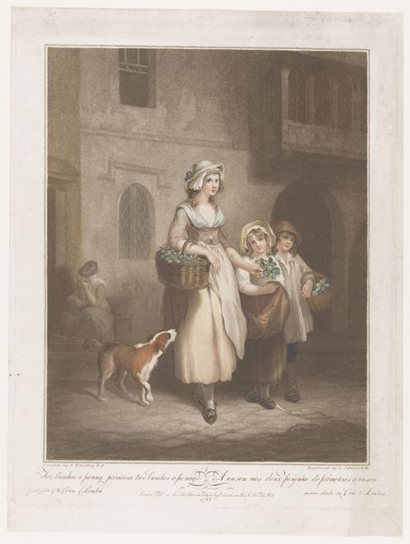 Luigi Schiavonetti created this print titled 'Melkmeid' around 1800, now residing in the Rijksmuseum. The print captures a milkmaid and two children on a London street, framed by the stark geometry of buildings and a towering obelisk-like structure. The composition, with its subdued palette, evokes a sense of the everyday, yet it's structured by contrasting forms. Consider how the artist uses the rigid architectural lines against the soft, rounded figures. This interplay introduces a semiotic tension between the built environment and the human form. The lines and shapes function as codes. The solid structures symbolize permanence, while the figures suggest transience and social dynamics. Notice the contrast between light and shadow, and how Schiavonetti renders the textures of clothing and the metallic sheen of the milk containers. These formal choices elevate the mundane scene. The artwork then becomes an exploration of social categories and class distinctions within the urban landscape, captured through a delicate balance of form and content.
