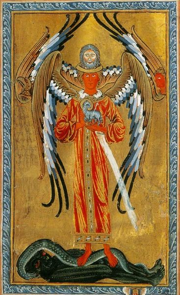 Curator: This piece is attributed to Hildegard of Bingen; we know it as Vision of Divine Love, and it's done in tempera. What stands out to you when you first look at this medieval painting? Editor: Chaos, but in a strangely comforting way. All these symbolic elements crammed together feel like a really intense dream you can’t quite shake off. Curator: Indeed, the artist utilizes a composition teeming with symbolic forms. The central figure, with the head of Christ crowning a figure in red robes, stands powerfully above a subdued, serpentine form. Observe how the sword divides the space, almost bisecting the beast. Editor: Right! The snake is like a grumpy footstool. But there’s also something hopeful, even fierce in those big wings. What is he holding there, a lamb? Curator: Yes, he holds a lamb and the sword suggesting sacrifice, victory. The allegorical depiction incorporates a miniature showing a divine vision, possibly Hildegard receiving the divine revelation, at the lower end of the panel. Notice how the figures below look like they're operating within a different plane. Editor: So, you’ve got cosmic drama happening above, earthly interpretations happening below. Makes you think about how these abstract, spiritual experiences get translated by the mundane, doesn’t it? The golden background lends to a timeless feel—really hammering in the otherworldly aspect. It’s fascinating how Romanesque artists were playing with depth and symbolism, trying to capture the invisible. Curator: Precisely, the interplay of the flat, golden background and the meticulously rendered figures reflects a fusion of Byzantine influences and emerging Western artistic sensibilities. The artwork exemplifies how medieval artists utilized allegory to communicate profound theological ideas and divine encounters, with semiotic weight carried through the strategic use of symbolism and figures like the vanquished serpent representing evil. Editor: This artwork really exemplifies how a simple story turns epic through symbolic imagery and careful artistic execution. After taking a look, you just can’t shake it from your head, it really has an iconic aura around it! Curator: Precisely. An excellent encounter with "Vision of Divine Love", which hopefully provided a better and insightful appreciation.
