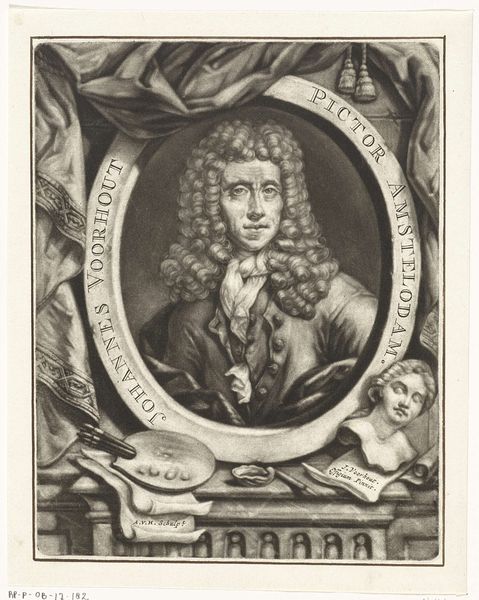 George Vertue made this portrait of Robert Boyle in the 18th century, using engraving techniques. This wasn't just about creating an image, but also about participating in a visual economy. Engraving, with its precise lines etched into a metal plate, was a method of reproduction. It allowed images to be disseminated widely, contributing to the growth of print culture. Look closely at the textures Vertue achieves – the flowing wig, the soft fabric of the sitter’s robe, and the scientific instruments arranged around the portrait. Each line is carefully placed, a testament to the engraver’s skill. The portrait isn’t just a likeness; it’s a meticulously crafted object, made through skilled labor. The image of Boyle is surrounded by the tools of his trade, referencing the scientific revolution. Consider the amount of work involved in producing an engraving like this. It speaks to the increasing division of labor in the 18th century, and how image-making was becoming more industrialized. This portrait challenges the traditional boundaries between art, craft, and commerce.