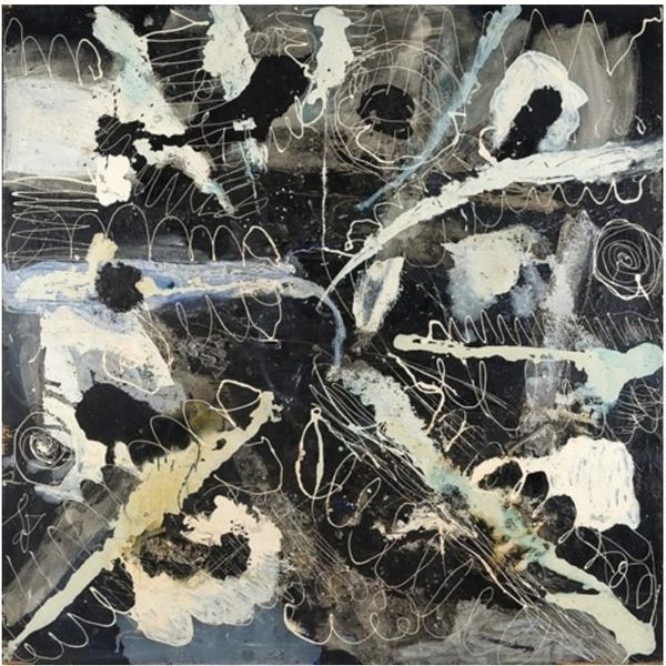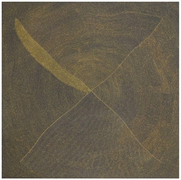 Curator: We are looking at an acrylic painting on canvas from 1983 by Luciano Bartolini, which he titled "Untitled." Editor: My initial reaction is a sense of slightly uneasy equilibrium. The circle feels complete, almost like a contained cosmos, but the elements within suggest dynamism, even conflict. Curator: Absolutely, the geometric forms generate that visual tension. The large, dark arcs push against the rigid lines, and the whole piece is given texture through the medium. This really shows how Bartolini adopted aspects of postmodernism and brought it to Mexico. Editor: I wonder if the circle represents wholeness and divinity in this context, juxtaposed with worldly concerns—the brown, tarnished elements that create disruption within. There is a hint of the celestial about it as well. Curator: The colour palette, of course, plays a large part. That mauve colour is used as an overwhelming ground; the painting is a masterclass in colour interactions. It is reminiscent of earlier abstraction but given an entirely fresh inflection by these slightly jarring formal combinations. Editor: Looking closer at those 'lines', the golden elements almost read as shards or perhaps sacred hieroglyphs that convey knowledge or stories through visual representation. It feels quite charged in that regard. The circular form could relate to the concept of cycles or cosmic energy. Curator: Your suggestion of glyphs intrigues me. Perhaps there is a relationship here to the wider semiotic landscape of contemporary painting, where mark-making is understood as a type of coding and the viewer is forced to interpret this abstract information, decoding the forms. Editor: Well, I think together we can agree that this work offers an opportunity to interpret many levels of symbolism. Curator: Indeed. Its formal arrangement offers a powerful aesthetic encounter.