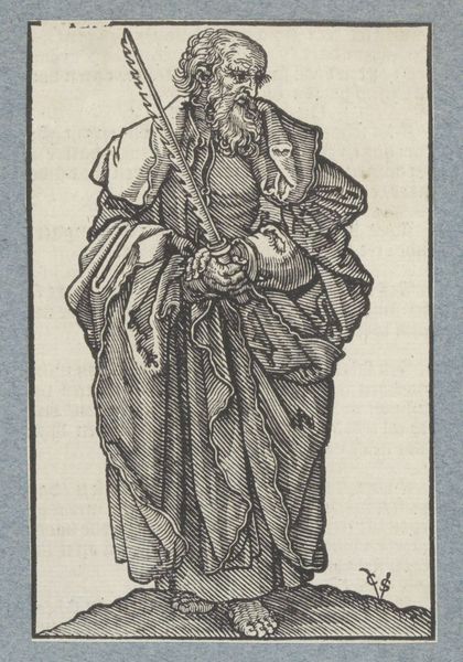 Curator: A solitary figure stands before us, seemingly lost in thought. There's a quiet stoicism in this image. Editor: Indeed. We are looking at "Reiziger met zak op de rug," which translates to "Traveler with bag on back," a graphite drawing by François Joseph Pfeiffer, created sometime between 1793 and 1835. It's a lovely example of the period’s romantic fascination with travel and the individual. Curator: The emphasis is absolutely on line and form here, isn't it? The graphite strokes meticulously define the drapery of his cloak and the texture of the bag he carries. Editor: And the lack of vibrant color definitely directs our attention toward form and light. Think about this in relation to social changes: at this point, increased infrastructure was transforming society, creating opportunities and, in parallel, a sense of dislocation, alienation. Is our anonymous wanderer part of this story? Curator: Absolutely. This was a time when artists started representing landscape and ordinary subjects differently, trying to depict a complex psychological state. We see some emphasis on shadow in this drawing, especially the way it grounds him and defines his forward movement, it would seem. Editor: The hat and cloak certainly add to his anonymity, yet paradoxically enhance a certain romantic individuality, wouldn't you agree? They obscure him, make him everyman, but give him a sort of nobility. Curator: I find it interesting that we, as modern viewers, interpret his journey through such a contemporary lens. At the time it was created, the work had much more to do with explorations of an idea rather than an actual travel experience. Travel served as a way of reflecting upon changes within society and one's personal relationships with place. Editor: I suppose both interpretations hold true, reflecting how the drawing bridges past and present sensibilities. Curator: Absolutely, the artist wanted to focus more on individual emotional interpretation of societal and historical changes. It’s easy to find that conveyed even centuries later through such careful form and balance. Editor: In the end, this modest drawing opens a doorway for questions related to exploration, solitude, identity, and a shifting society, quite an achievement using only graphite.
