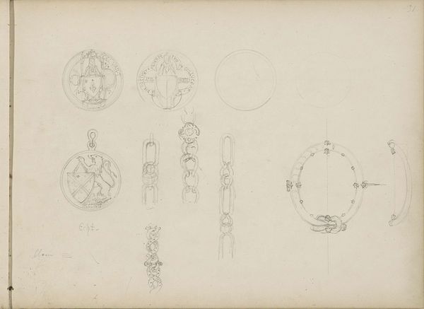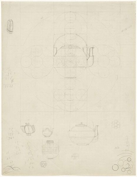 Curator: This is "Godslamp, Grave," a page from Pierre Joseph Hubert Cuypers' sketchbook, dating from around 1857 to 1859. It’s an ink drawing on toned paper, part of the collection at the Rijksmuseum. What are your initial thoughts? Editor: Stark, almost sterile. The aged paper contributes to the austerity. The linear quality and faint pencil work suggests a mind at work—organizing and drafting a design. Curator: Exactly. Note the precision of the circles and the meticulousness of the gothic architectural elements on the lamp. The structural underpinnings of this object seem as important as the ornamentation itself. Editor: It is almost like a blueprint, a functional diagram alongside more symbolic details. The “Godslamp” is quite suggestive. Lamps in graves can signal enlightenment shining in the darkness or eternal watchfulness over the deceased. Do we know the significance of this particular design? Curator: Cuypers was, of course, a major figure in the Gothic Revival in the Netherlands. His work on church restorations would require careful attention to the iconography, referencing established conventions and introducing new variations to fit specific theological programs. Here we have an interesting juxtaposition of careful geometric form, coupled with highly ornate and religiously symbolic ornamentation. Editor: I'm intrigued by how this seemingly simple sketch unlocks layers of cultural meaning and craftsmanship. One sees the confluence of geometry and spiritual symbolism. The light from the lamp banishes death and gloom and becomes almost like an ensign of Christian resurrection. Curator: A testament to the layered symbolism present in functional forms. These designs are more than what they initially seem: a careful consideration of religious iconography through functional design. Editor: It underscores how art is not just about the final form but about the embedded beliefs, and it’s rewarding to engage with such details. Curator: Agreed; a simple sketch on toned paper becomes a fascinating insight into Cuypers' creative process and cultural landscape of the period.