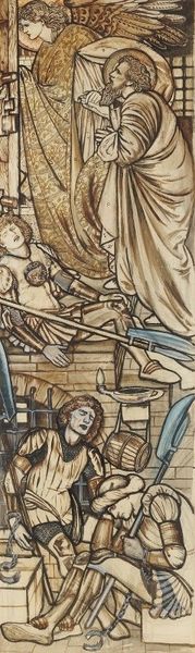 Curator: This work is "Angels and Children", a drawing by Edward Burne-Jones, associated with the Pre-Raphaelite movement. Editor: Wow, it gives me a serene but also sort of melancholy vibe. All those watchful angels, and that solemn child holding the flower. The colors are muted, dreamy. It's like a forgotten hymn. Curator: The Pre-Raphaelites often engaged with themes of nostalgia, spirituality, and idealized beauty. Their stylistic choices rejected what they perceived as the academic rigidity of the Royal Academy, drawing inspiration instead from medieval and early Renaissance art. This drawing appears to explore these same concerns. We might interpret the angels as symbolic guardians, protectors of innocence perhaps? Editor: Mmm, absolutely. But it makes me think about how innocence itself is protected and who gets to do the protecting? That baby being held aloft looks… precarious, almost. Are the angels guardians or complicit observers? Like, in some ways they're hovering around this young person holding a flower, who almost looks scared and pensive. Curator: That’s a powerful point. This connects to the ways Pre-Raphaelite art engaged, often problematically, with Victorian ideals of femininity and childhood. The symbolic weight placed on these figures—their perceived purity—often obscured the complex realities of gender and class in Victorian society. One can consider the aestheticized presentation of these children within the larger context of childhood labor, sexuality, and representation at the time. Editor: Exactly. I almost wish the Burne-Jones drawing weren't so pretty because this underlying thing is haunting me. Maybe that's the drawing's secret punch. I suppose it does its job well in that it's lingered this long and evoked these thoughts. It definitely gives pause and opens all kinds of wormholes. Curator: I agree. It reminds us to look beneath the surface, to consider the cultural anxieties and the implicit power structures at play, in Burne-Jones’ art. The composition becomes less about simple beauty and more about an exploration of societal expectations and constraints. Editor: Okay, okay, you convinced me. Maybe that dreamy haze *is* a clever trick—the Pre-Raphaelites were pretty savvy about the dark undertows of beauty, weren’t they? And this drawing has those in spades. Curator: Precisely. Thank you for sharing those intuitive responses!