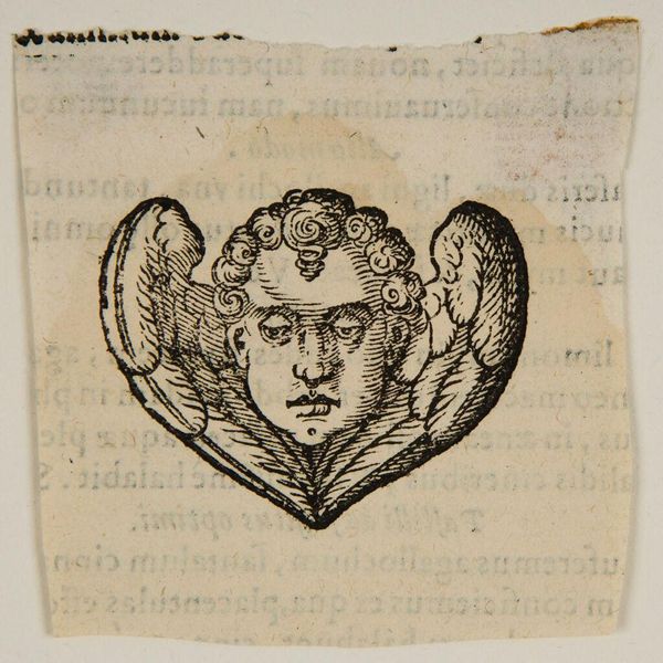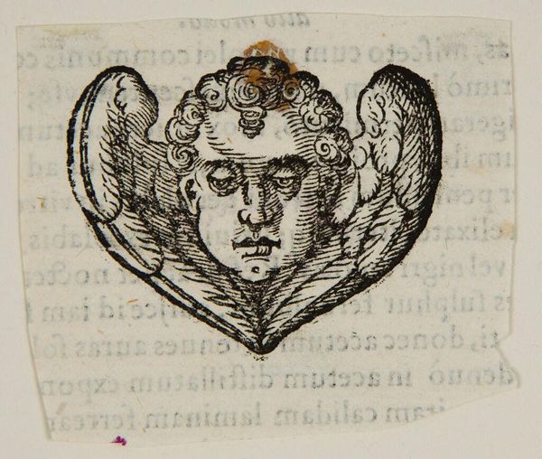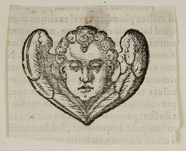 Curator: Here we have an illustration of an angel's head with wings, taken from Giambattista della Porta's *Magiae Naturalis*. It's unattributed. Editor: It’s a rather melancholy angel, wouldn't you say? The stark lines of the engraving, the downturned eyes, lend it a weight that’s quite surprising. Curator: The image appeared in a book devoted to natural magic...so perhaps it carries that implication. Angels acting as mediaries between worlds. Editor: Absolutely. The formal symmetry of the wings, framing the face, gives it a sense of balance, even if the expression suggests inner turmoil. Curator: These illustrations speak to a worldview where the spiritual and physical realms intermingle, a belief system with deep roots. This book offered practical applications, formulas. Editor: So a winged figure becomes a symbol not just of faith, but potentially, of tangible power? I find the contrast fascinating. Curator: Precisely. A reminder that symbols evolve. Editor: Indeed, much to contemplate.