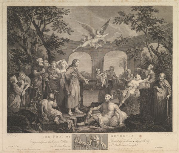 Curator: What a vibrant scene! The Rijksmuseum holds this anonymous engraving, "Sancho Panza doet op een markt inkopen," created sometime between 1670 and 1742. The baroque style brings a great sense of theater to the everyday. Editor: It has an incredibly detailed tableau. I am immediately drawn in by the figures seemingly in the middle of some vibrant communal feast, set against the backdrop of these quaint, almost sterile-looking houses. It seems almost chaotic and unsettling with that strange tent on the left. Curator: You know, the figure of Sancho Panza himself represents a lot of conflicting cultural symbols: the loyal servant versus the hedonistic peasant, grounded pragmatism contrasting with fantastical idealism. It brings to life many narrative threads. Editor: Absolutely, the division between leisure and labor strikes me— the central tension I think is that dichotomy within Sancho, caught between obligation to his master and desire for basic satisfaction of taste and belonging. Are these images of joy and leisure ultimately aspirational fantasies or mocking assertions? The social dynamics seem ripe for interrogation! Curator: This engraving clearly stems from genre painting traditions, taking scenes of daily life and using them to explore social relationships. But note, how different groups form across this composition; each group offers a subtle commentary on societal harmony— or perhaps disharmony. Editor: It certainly makes you think about historical marketplaces, hubs of exchange, not only commodities but gossip, alliances, class friction, even revolts and conspiracies… these bustling spaces created both social order and disorder. Perhaps Sancho's experience at market, therefore, is a metanarrative regarding larger class dynamics within this older Dutch society? Curator: That interpretation connects this to much larger themes surrounding early European history, bringing together considerations of the market, family life, the class divides, as presented in a baroque and classical realist styles. These archetypes appear consistently. Editor: Right, analyzing works such as this from multiple lenses gives the work contemporary resonance— it’s about more than Don Quixote fan fiction. Curator: Agreed. Delving into iconography reveals so much history. Editor: And critically deconstructing such imagery gives clues on what to resist going forward.