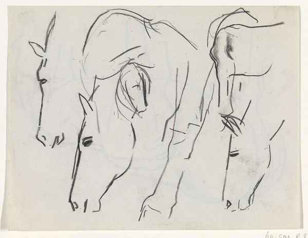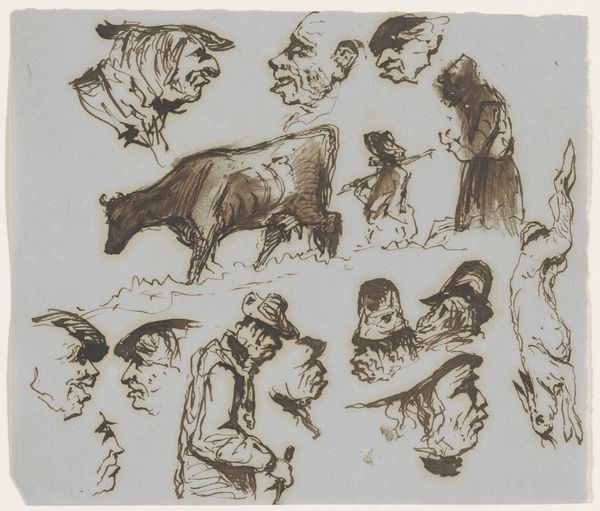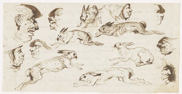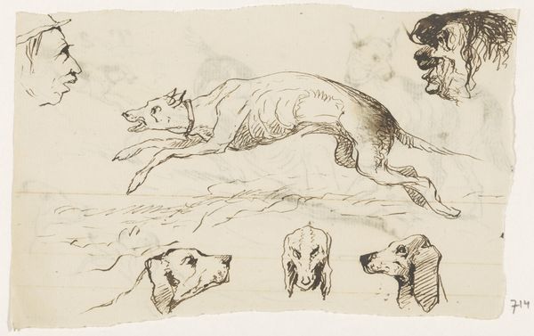 Curator: At first glance, the pen and ink drawing “Hondenkoppen”, created sometime between 1840 and 1880 by Johannes Tavenraat, presents as an exploratory sheet filled with studies of canine heads. What immediately strikes you about it? Editor: The sheer energy of the lines! It feels so raw, almost like capturing fleeting thoughts. Some of the dog portraits are simple outlines, while others have a real depth to them because of the repeated, dense hatching, so material. Curator: Precisely. Observe the variation in line weight. See how Tavenraat employs a delicate, almost tentative line to delineate the contours of certain snouts, while others, particularly around the eyes, are rendered with much more aggressive, emphatic strokes. This creates a deliberate hierarchy of focus. Editor: I notice too, how the paper itself seems to be a participant. There’s some visible aging, which is a reminder that this wasn’t some digitally produced perfection, but something handled, something crafted, a by-product of real labour. And those ink traces outside the head contours, are those deliberate or the result of the penmanship? Curator: A little bit of both, I suspect. It creates depth to the various drawings but without the need for color, and these textural aspects are heightened by the uniformity and minimal use of space. These dogs are not individual subjects as such; each rendering feeds into the collective study of 'dogness'. They become semiotic representations of canine identity, abstracted through Tavenraat’s formal treatment. Editor: Yes! I find it curious that we're referring to Tavenraat's hand skills while looking at dogs' heads. His skilled manipulation of pen and ink enables such subtle gradations and evokes texture but at the same time it feels spontaneous and almost impulsive! It makes one wonder about his intention here—practice, playful observation, commission or mere hobby? Curator: Whatever the intention, its beauty resides in its execution and abstraction. It invites us to appreciate Tavenraat's capacity for both analytical observation and artistic expression. Editor: And appreciate the intrinsic labor and its tangible materiality, through his use of such straightforward implements of making to deliver something special, from his hands directly into the viewer's consciousness.