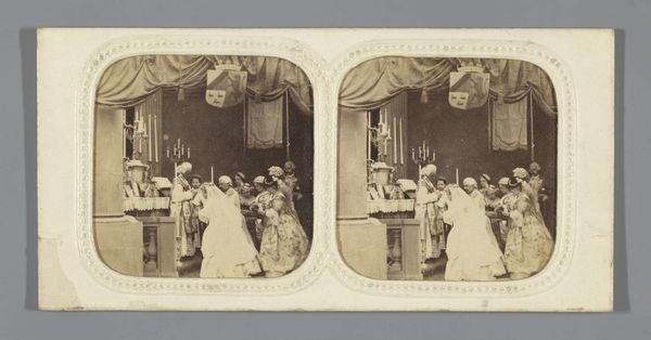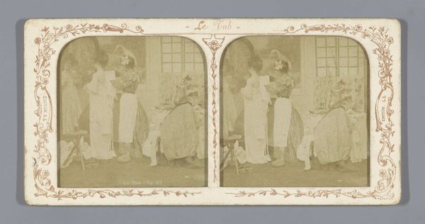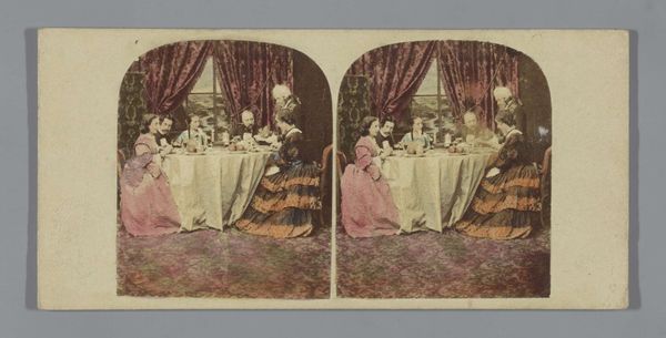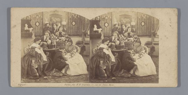 Curator: The sepia tones give it an aged feel, like looking through a misty window into the past. It depicts a mother with her son and daughter seated around a table laden with objects, isn't it? Editor: Precisely. This intriguing work is titled "Portret van Henry Pauw van Wieldrecht (links), Adriana Johanna ('Jenny') Pauw van Wieldrecht (rechts) en hun moeder, Aletta Cornelia Anna Voombergh". Likely produced as a gelatin silver print sometime between 1869 and 1873, it exists as a testament to a specific moment within that family's history. The image strikes me, though, with a certain formality. It is so stiffly posed; they seem quite self-aware of being observed and memorialized. Curator: And consider that this photograph comes from a period of relative transition. Although these domestic images seem timeless and eternal now, consider the implications this medium had for family and gender in late 19th-century Holland. How fascinating that such an intimate genre scene could have far reaching cultural implications at the time! Editor: True, the context shapes our perception. But I can't help noticing those little details. The cactus for example sitting in the table center. Symbolism often resided in the seemingly mundane, imbuing the photograph with layers of unspoken meaning. Curator: Cacti carry associations of endurance, perseverance... things rooted in the desert and hardship... But do they suggest familial perseverance here? Editor: Well, that is the core question, isn't it? Beyond just documentation of a moment, photography gains prominence within genre painting. What are these portraits trying to express or elicit? I see, instead, the cacti acting as an aesthetic object. An eccentric accessory demonstrating refinement and elevated taste. Curator: That feels reductive, doesn't it? This image provides an entryway into the emotional terrain of familial connection. To simply ignore all symbolic weight—! Editor: Well, either way, there is some visible damage to this silver gelatin print that only enhances its inherent melancholic qualities. Curator: Ultimately, isn't art always speaking in riddles? These glimpses into history—through the eye of a lens or even a familial cactus—leave you endlessly thinking. Editor: Yes, thinking and hopefully seeing how portraits acted as socio-cultural and art objects. Each family image can reflect wider political and class assumptions in such early uses of the medium. Thank you for your iconographical approach; I would not have examined that familial lens as carefully without your insights.