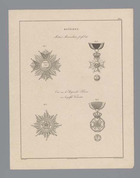 Curator: This detailed print from 1843 by Willem Charles Magnenat depicts various orders from Genoa and Greece. It's currently held in the Rijksmuseum. Editor: My initial impression is how meticulously rendered each design is. You can practically feel the weight and texture of the materials used to create these awards. Curator: Exactly! Consider these insignia beyond mere symbols of valor or service. They speak to a specific moment of nation-building and social hierarchies. What values were being upheld, rewarded, and consequently, excluded? Editor: Good point. And let's look closer at the methods of production here, particularly at the level of craft involved in rendering these highly specific graphic objects that evoke military achievement. Who were the engravers reproducing these images, and what were their own roles within that system? Curator: Those labor relationships are key, highlighting often invisible elements propping up these displays of authority and the political context behind these honors. In nineteenth-century Europe, awards represented the interwoven relationships of political capital, power and influence. Editor: It is important to remember too that there's the practical business of creating the engravings, the social transaction of buying and selling them, the movement of the products of labor in the engraving process to the location of viewing. And paper, ink, and engraving tools all imply global material networks, no? Curator: Certainly, these details are essential reminders of interconnected global trade routes that make such productions possible. Editor: So in looking at the labor to make the medals, the labor of the artist in engraving them, and then tracking their circulation, it reminds me that art, even historical graphic art like this, is fundamentally connected to everyday life and tangible processes of making and consumption. Curator: I agree completely! Considering that these historical medals, now artifacts presented for posterity, are documents of social relations—both of power and the often unacknowledged networks that sustain displays of hierarchy. Editor: And to examine those objects with that awareness allows us to see them not as fixed monuments of history but as stages within a dynamic, complex global network of power and people, materials, production, consumption, circulation, and exchange.