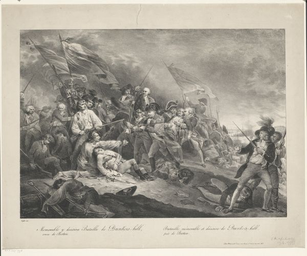 Willem van Senus created this artwork, "Prins van Oranje in de slag bij Quatre-Bras, 1815," using an engraving technique. The monochromatic palette immediately sets a somber tone, reflecting the gravity of battle. The composition is structured with the Prince of Orange as a focal point, elevated on horseback amidst the chaos. Observe how Van Senus uses linear perspective to draw our eyes to the background, where masses of soldiers and the suggestion of buildings hint at the scale of conflict. The dense arrangement of figures and the stark contrast of light and shadow might remind you of Baroque battle scenes, yet there’s also a flattening effect, particularly in the rendering of the fallen soldiers. It's as though Van Senus is less interested in heroic individualism and more in the collective experience of war. The visual signs evoke an emotional response, prompting reflection on the weight and complexity of historical events. Consider how the formal qualities of the artwork shape our understanding of history.