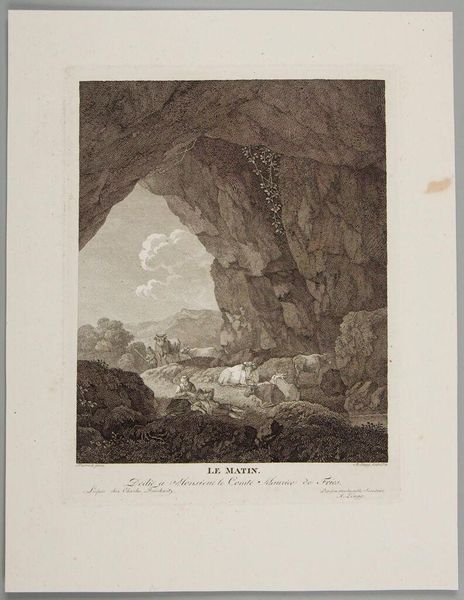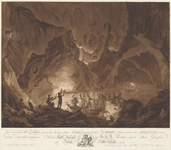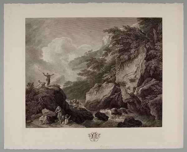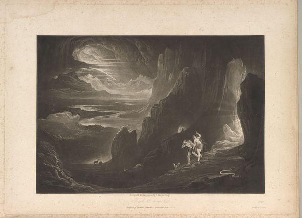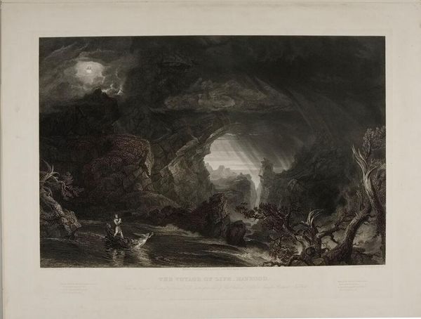 Editor: Here we have James Smillie's "Childhood", an engraving. The sharp contrast between the dark cave and the bright figure in the boat is really striking. What do you make of the composition? Curator: The piece employs a sophisticated use of chiaroscuro, guiding the eye from the shadowed depths to the radiant figure. Note how the engraver's skillful lines create textures that mimic both the solidity of the rocks and the fluidity of water, enhancing the allegorical voyage. The formal elements establish a thematic duality. Editor: So, the light and dark aren't just visual, they're symbolic too? I never considered that level of interplay. Curator: Precisely. Editor: This piece is more complex than I initially thought. Thank you!